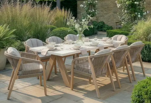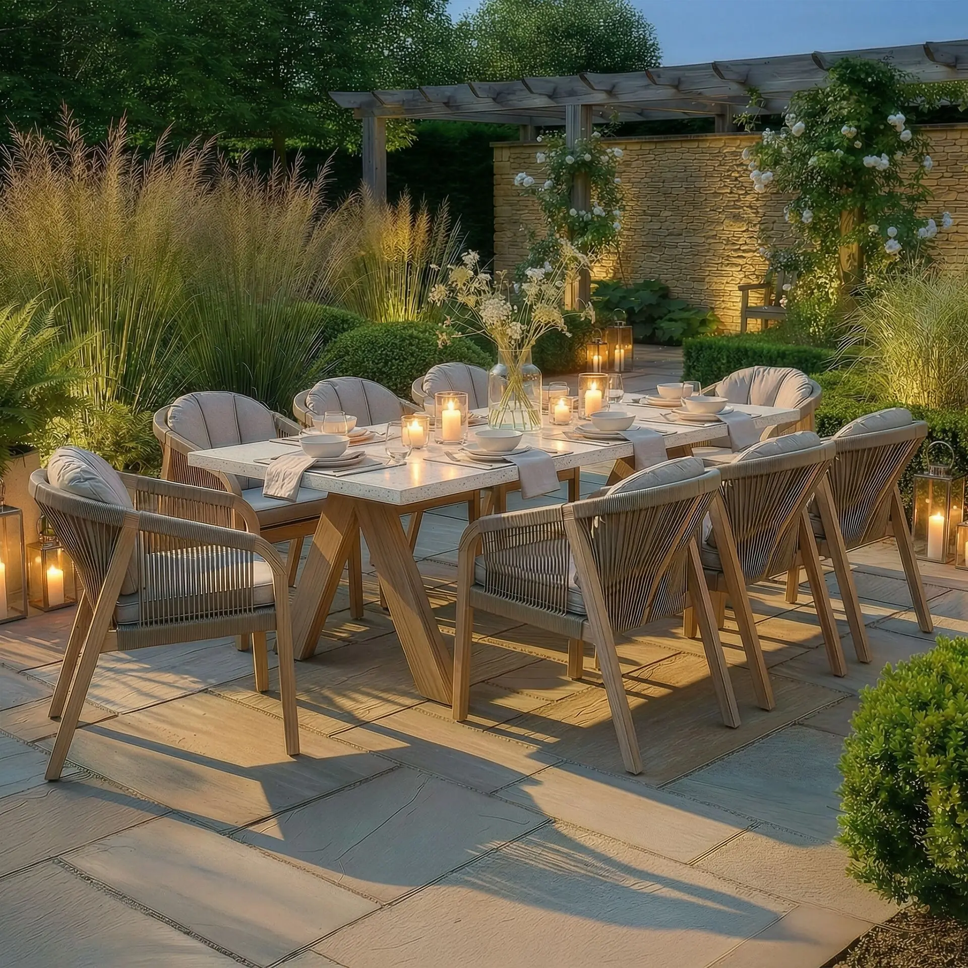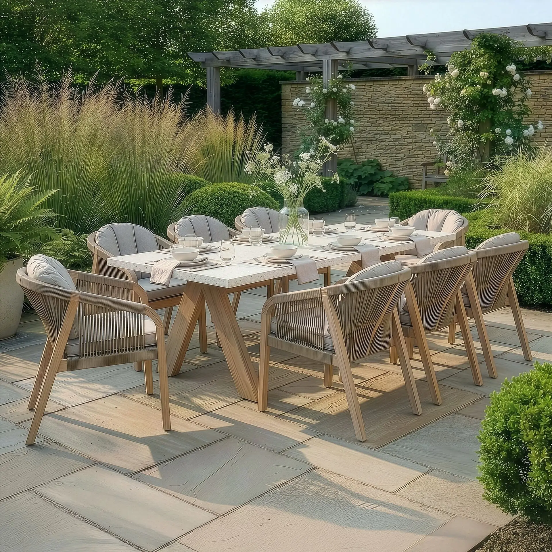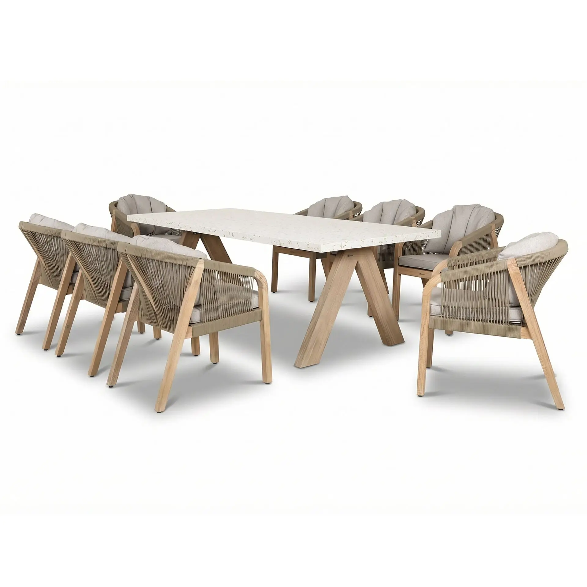 Colour: Terrazzo Concrete Top withTaupe with sandstone cushions, dining experience with the Antigua 8-Seat Rectangular Dining Set, a perfect harmony of style and functionality. This garden furniture set features a spacious rectangular dining table finished with a contemporary white terrazzo concrete top.