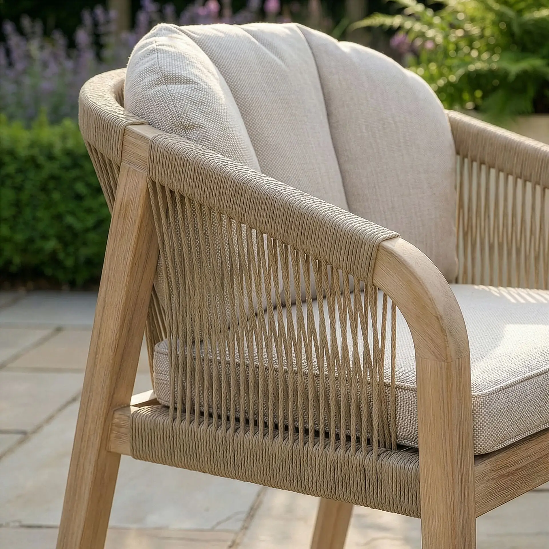 The Antigua Dining Set showcases FSC-certified acacia wood throughout the framework, combining sustainability with lasting durability. Over time, the natural wood will gradually transition into a beautiful silvery grey hue, adding character and charm to your outdoor space. Each piece has been finished with a protective PU coating, enhancing the wood’s resilience while keeping maintenance to a minimum.