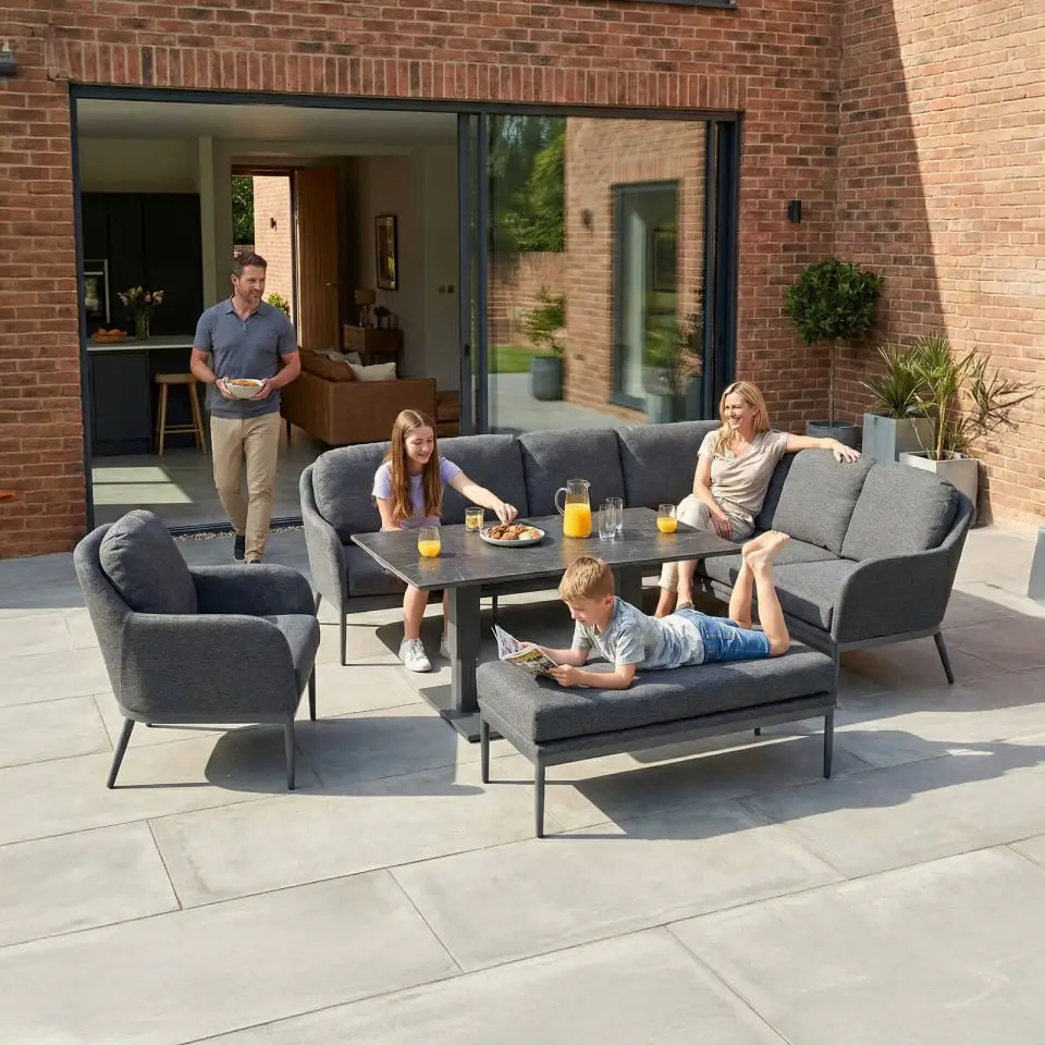 The Ally Left Hand Corner Sofa Lounge Dining Set with Rectangular Rising Table, Double Bench Stool & Armchair - Grey combines thoughtful design with modern functionality, creating the perfect setting for comfortable outdoor lounging and dining.