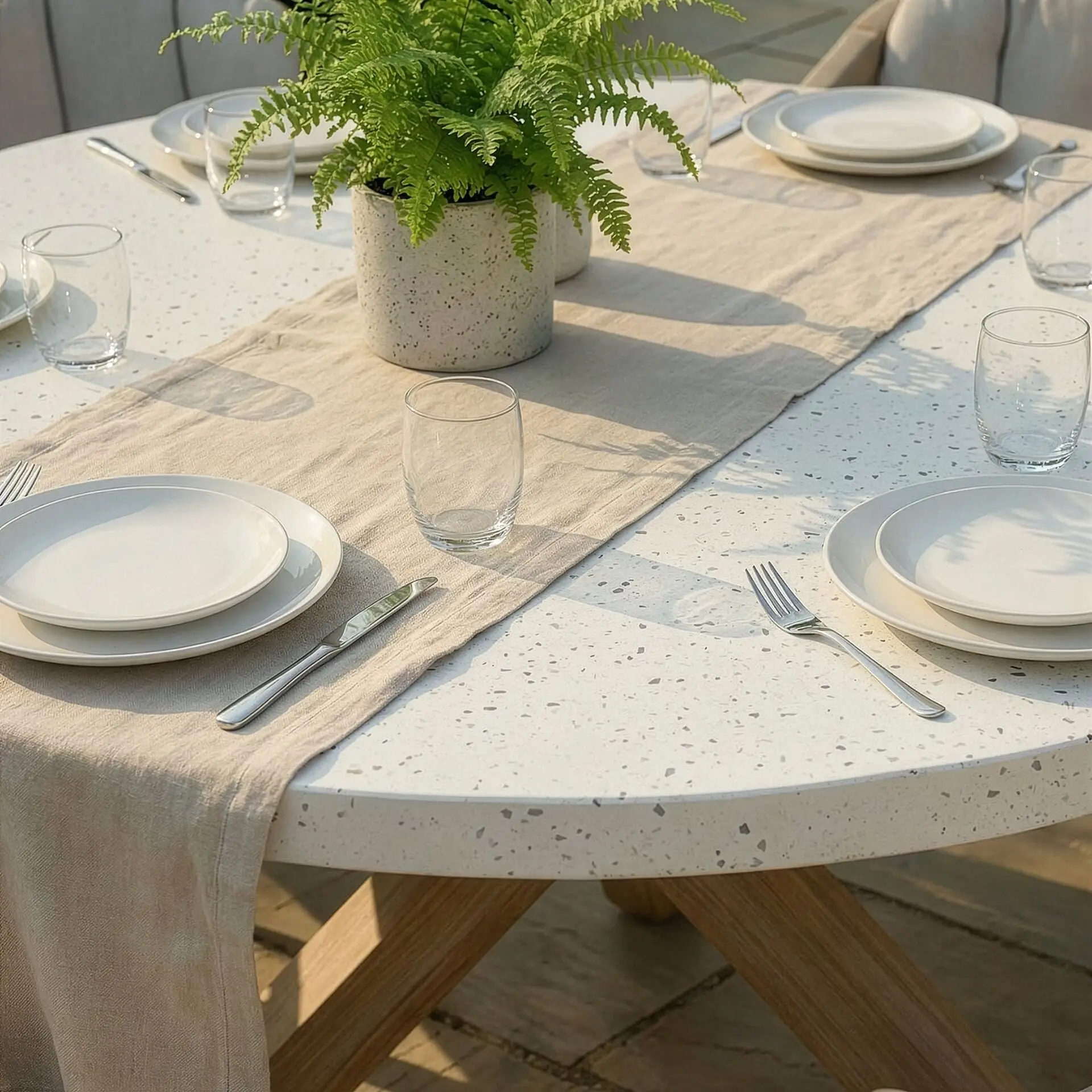 Create a refined outdoor dining setting with the Antigua 6-Seat Round Dining Table, designed to bring both elegance and practicality to your garden or patio. The generously sized round tabletop, crafted from white terrazzo stone, offers a clean, contemporary look while providing the perfect surface for relaxed al fresco dining.