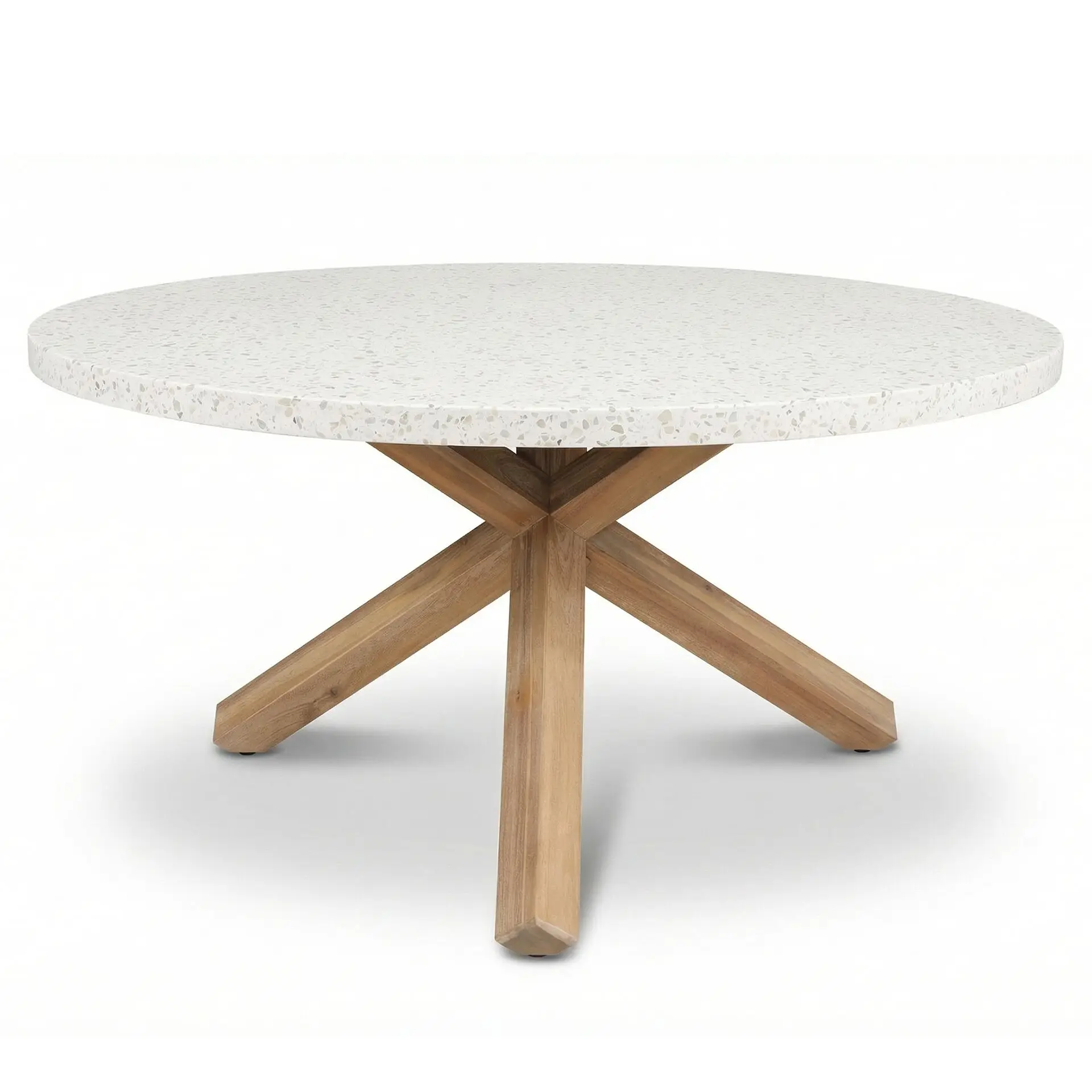 Supported by an FSC-certified acacia wood base, this table combines natural strength with timeless appeal. As the wood ages, it will develop a soft silvery grey patina, adding depth and character to your outdoor furniture. The white terrazzo stone top not only elevates the design but also delivers a hard-wearing, low-maintenance surface suited to outdoor use.