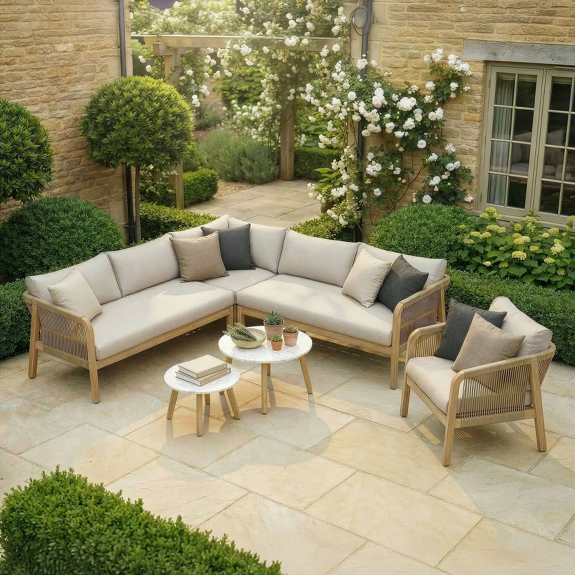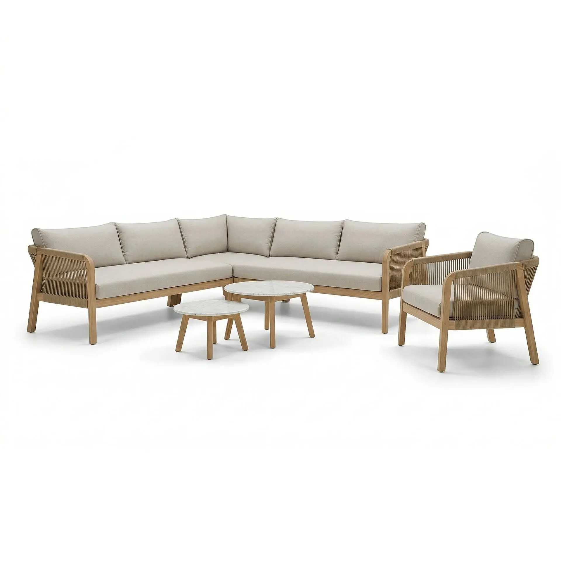 Antigua Rope Weave Corner Sofa Set - Lounge Chair & 2 Round Coffee Tables