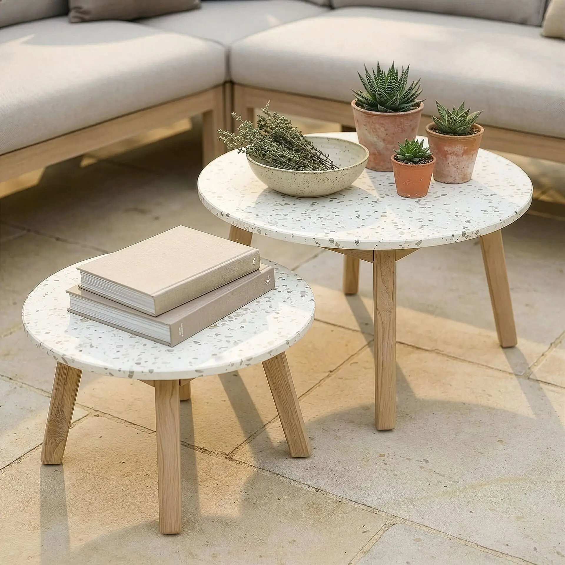 Featuring elegant light brown antique-finish acacia wood accents, a durable all-weather rope weave, sleek terrazzo concrete tops, and sumptuous 10cm-thick cushions, the Antigua Corner Sofa Set delivers both style and substance. Whether you’re unwinding with family or hosting friends, it provides the perfect balance of luxury and practicality.