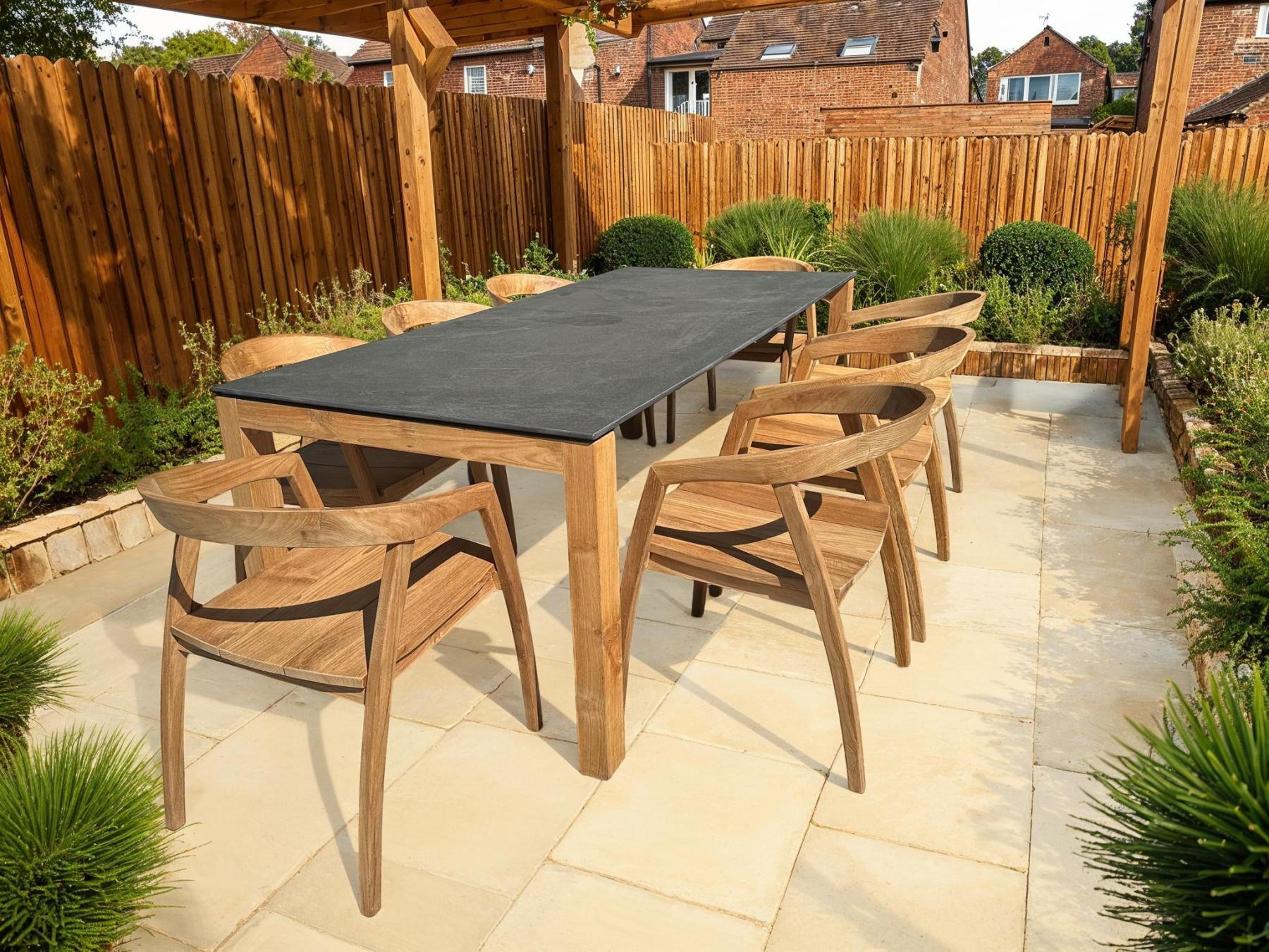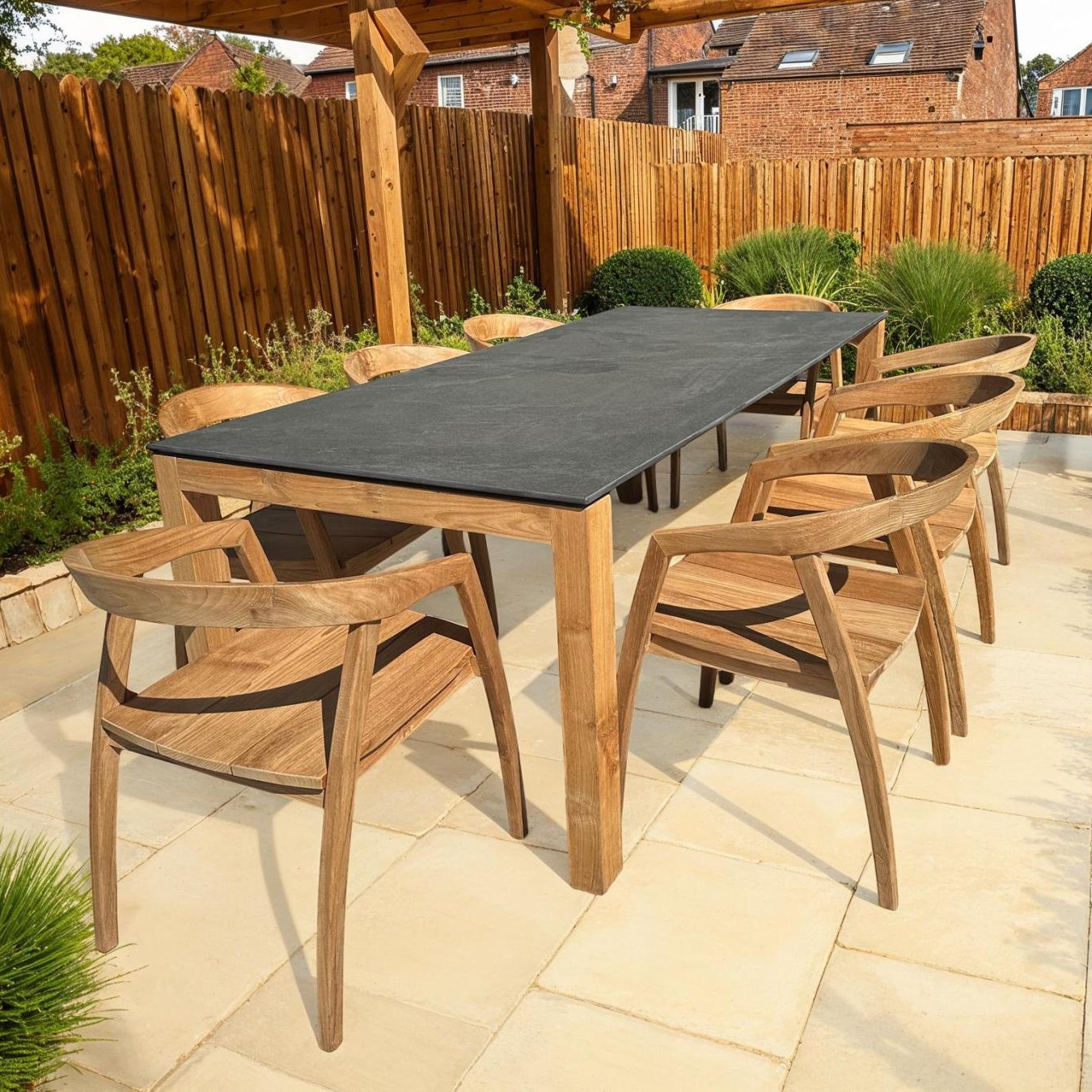 With a robust and sustainable scratch-resistant ceramic tabletop, this outdoor dining table is full of style and elegance to fit in any garden space. Finished with a reclaimed teak frame, this table is ideal for being left outdoors even in harsh weather conditions so you do not have to worry about any erosion, weathering, or external debris damaging the wood!