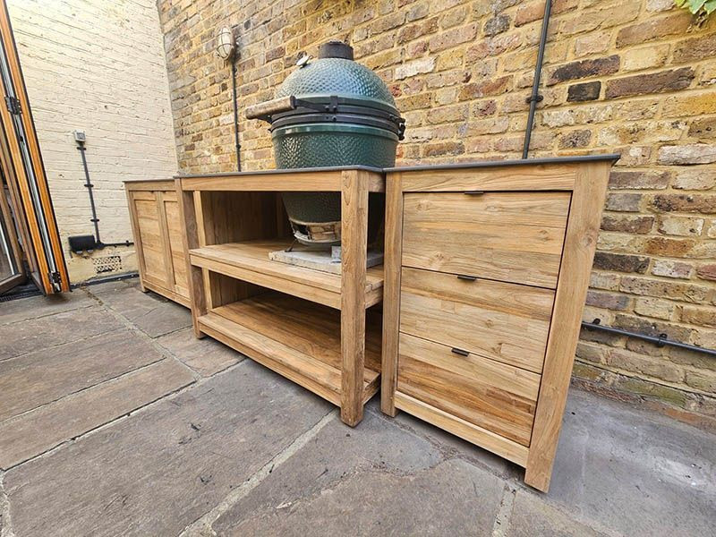 Kitchen Big Green Egg Table is crafted out of reclaimed teak which is the perfect way to house your new outdoor cooking area with style! This unit is the ideal place to fit your Big Green Egg Barbecue