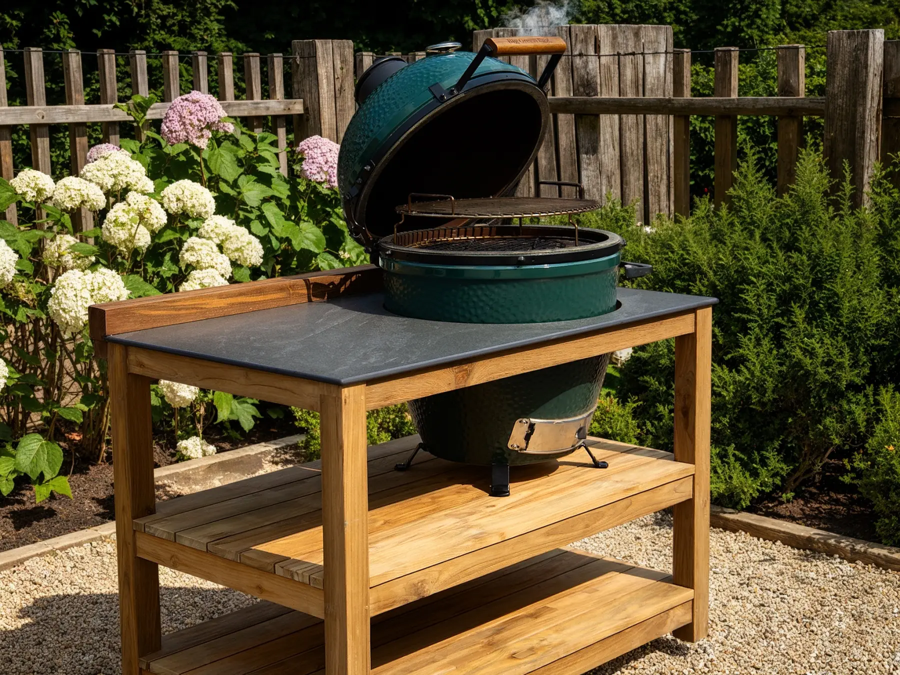 Fully efficient and finished with a beautiful teak exterior, this Big Green Egg Table Unit is crafted to last you a lifetime.