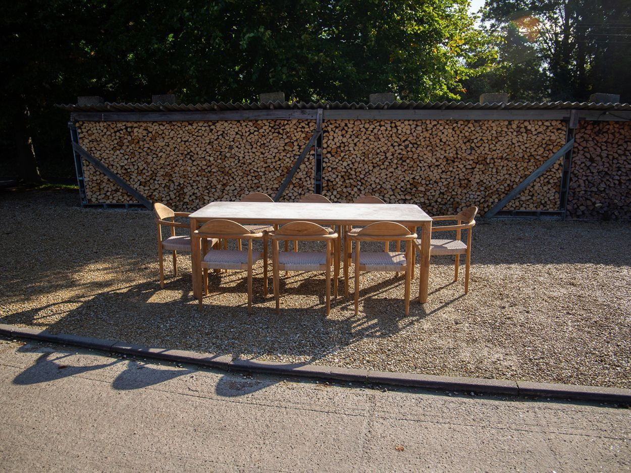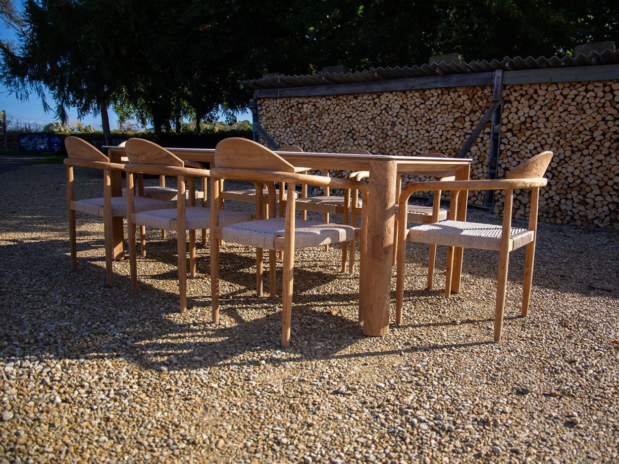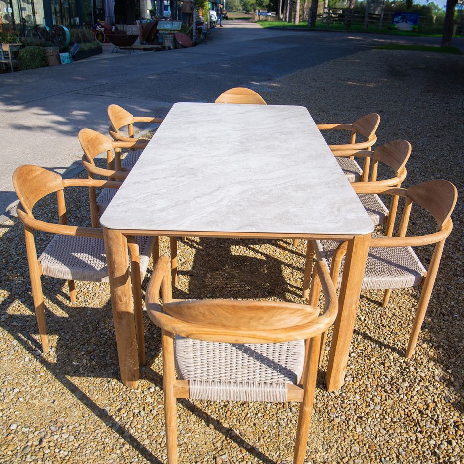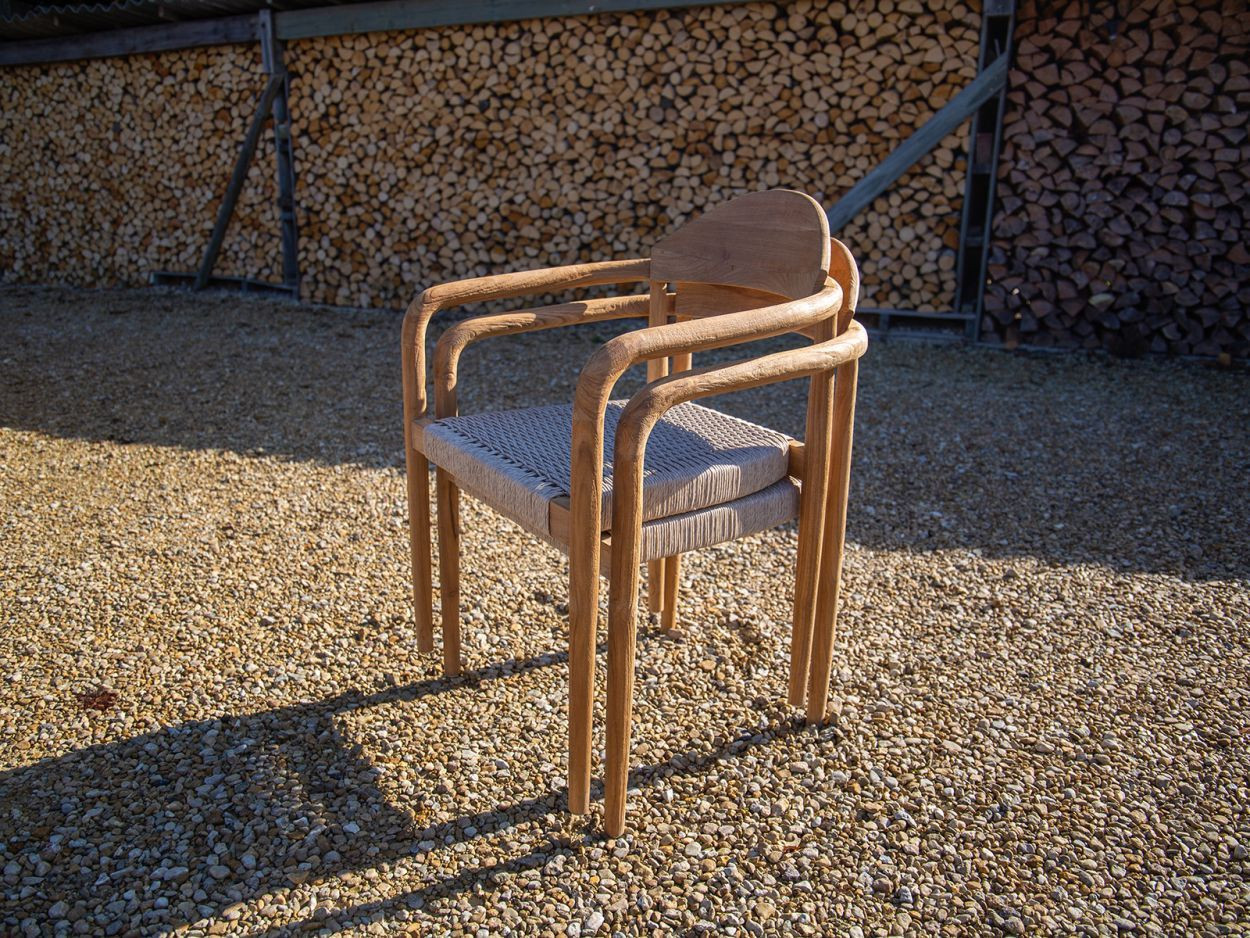 Paired with eight matching Bella dining chairs, the set offers generous comfort without sacrificing style. Each chair features the same reclaimed teak framework, with a gently curved backrest and all-weather woven seat. Designed to support long, lazy evenings around the table, they also stack neatly when not in use, making them a smart option for flexible spaces.