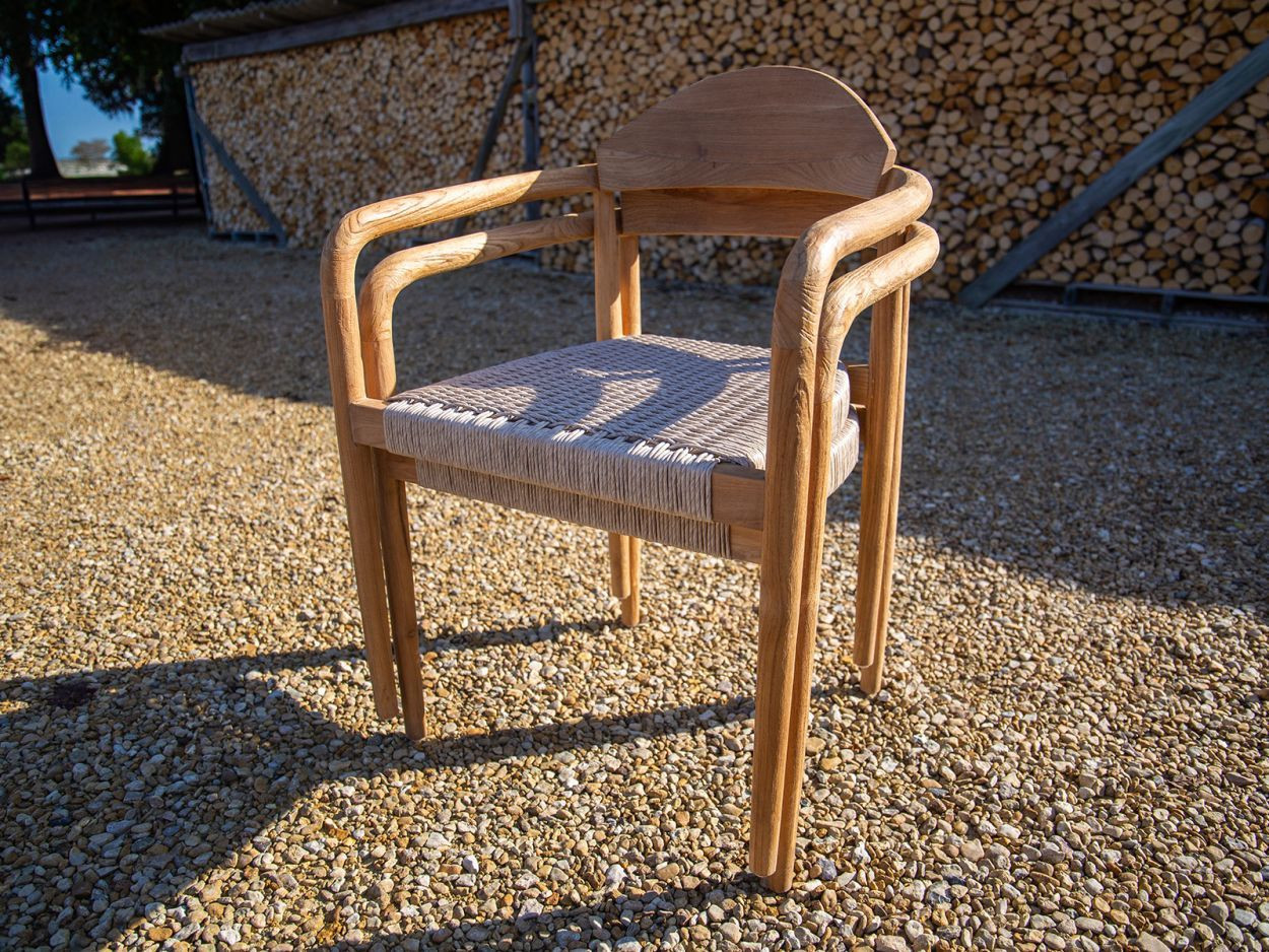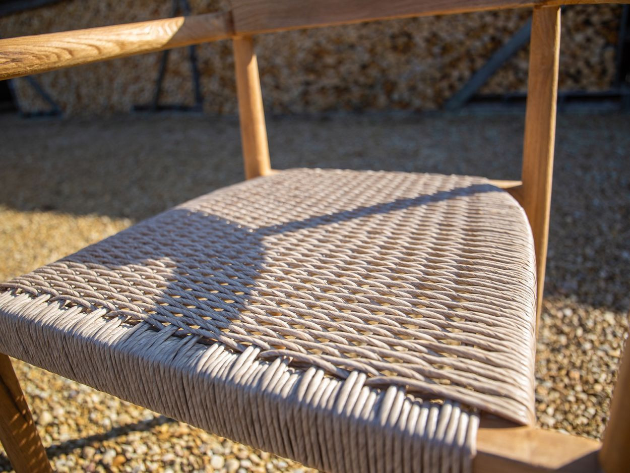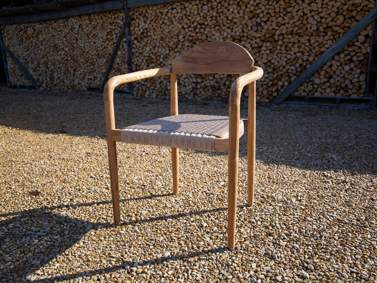 Paired with eight matching Bella dining chairs, the set offers generous comfort without sacrificing style. Each chair features the same reclaimed teak framework, with a gently curved backrest and all-weather woven seat. Designed to support long, lazy evenings around the table, they also stack neatly when not in use, making them a smart option for flexible spaces.