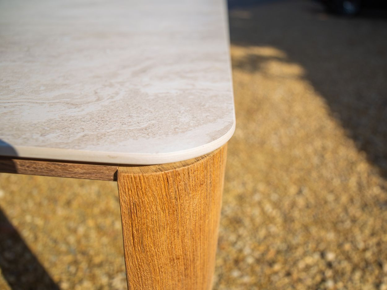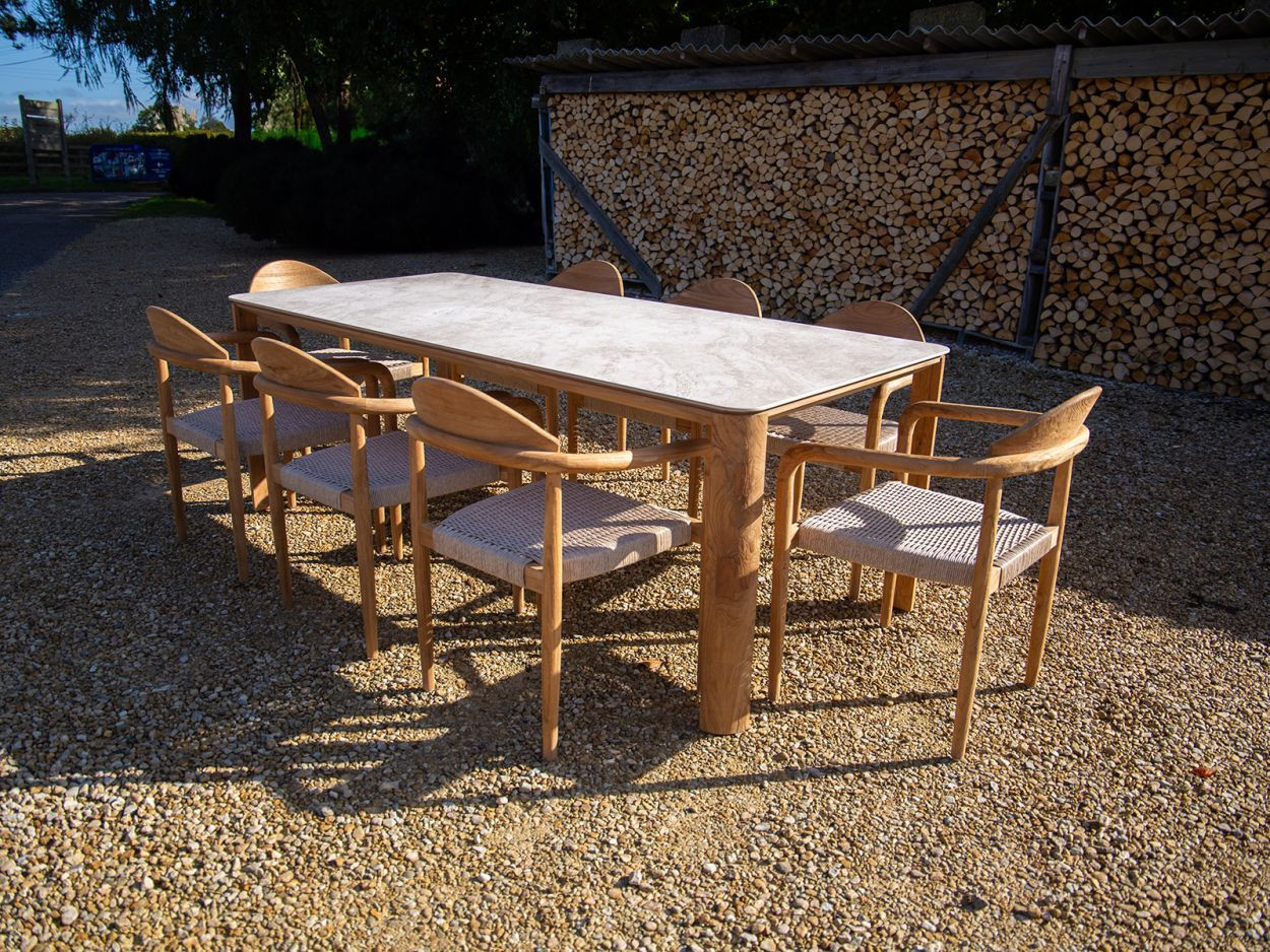 The reclaimed teak frame has a solid, grounded feel, rich in grain and warm in tone. It’s a wood that tells its own story—sustainably sourced and naturally suited to life both indoors and outdoors. The ceramic tabletop adds a modern contrast: cool to the touch, easy to clean, and fully resistant to stains and scratches. Its soft cream finish lifts the overall look, creating a space that feels bright, airy, and inviting.