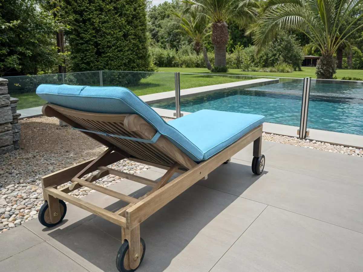 The perfect Sun Lounger Set to lie down and relax by the pool. The SunLounger is made with Teak wood and has a fully adjustable back and leg rests, and with its built-in drinks tray, you can make sure a refreshing drink is nearby, and with its built-in rear wheels.
