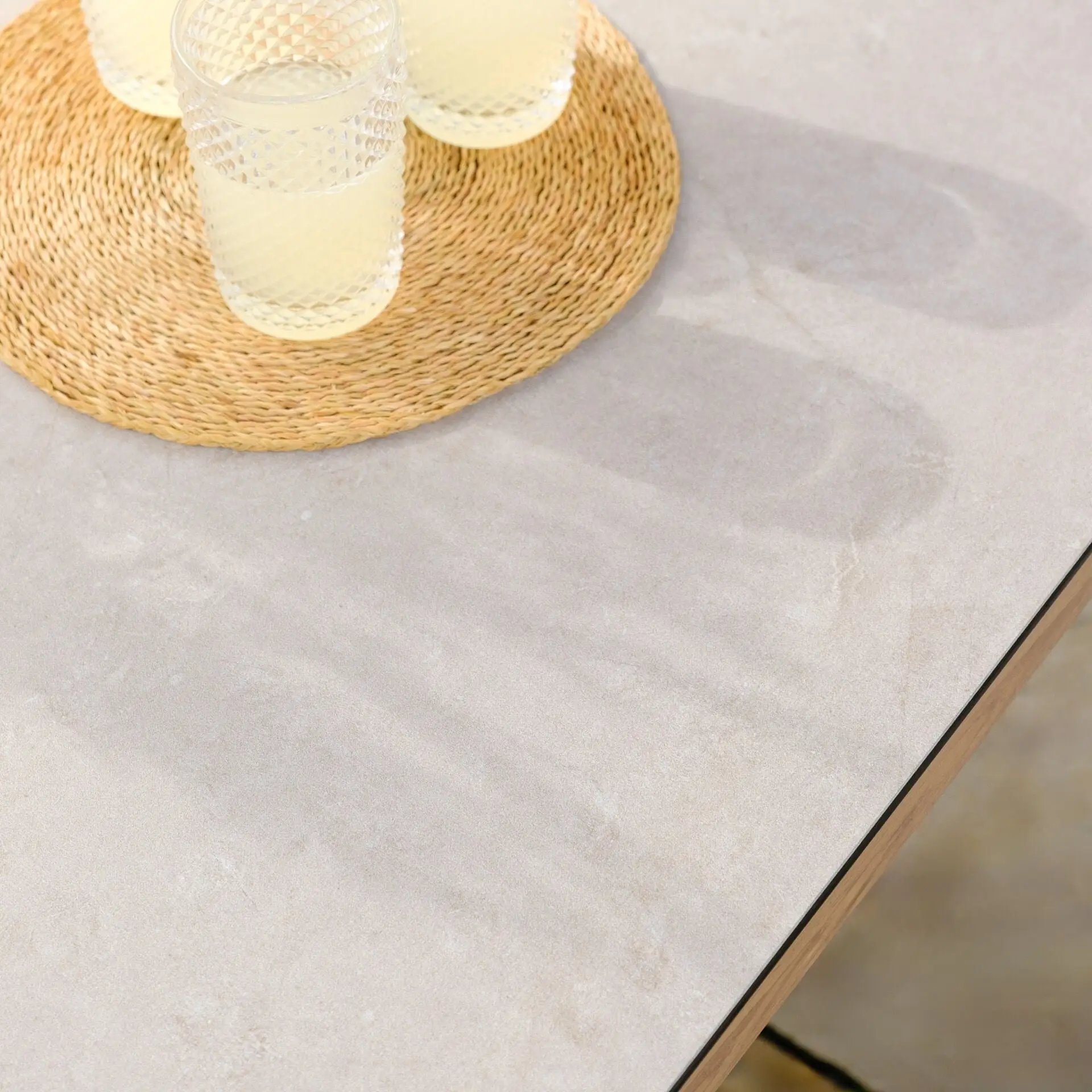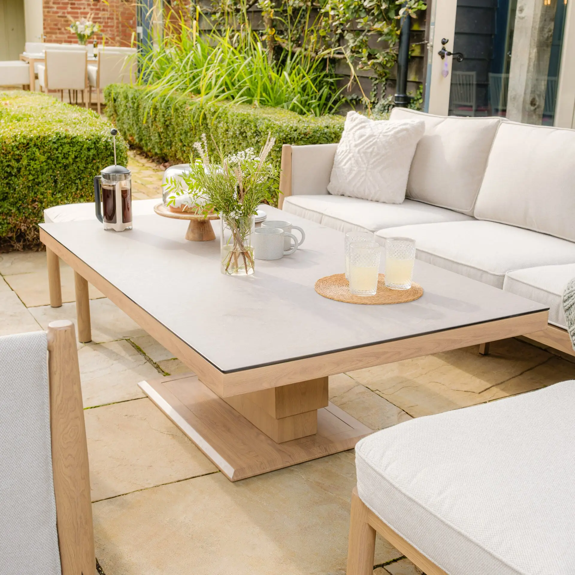 The innovative rising table, finished with toughened tempered ceramic printing glass, easily adjusts from a low coffee table to a dining height surface, offering flexible use for both lounging and dining. Complementing the design, the comfortable piped cushions are made from SeasonSure fabric, providing shower-resistant, stain-resistant performance with removable sleeves for effortless cleaning.