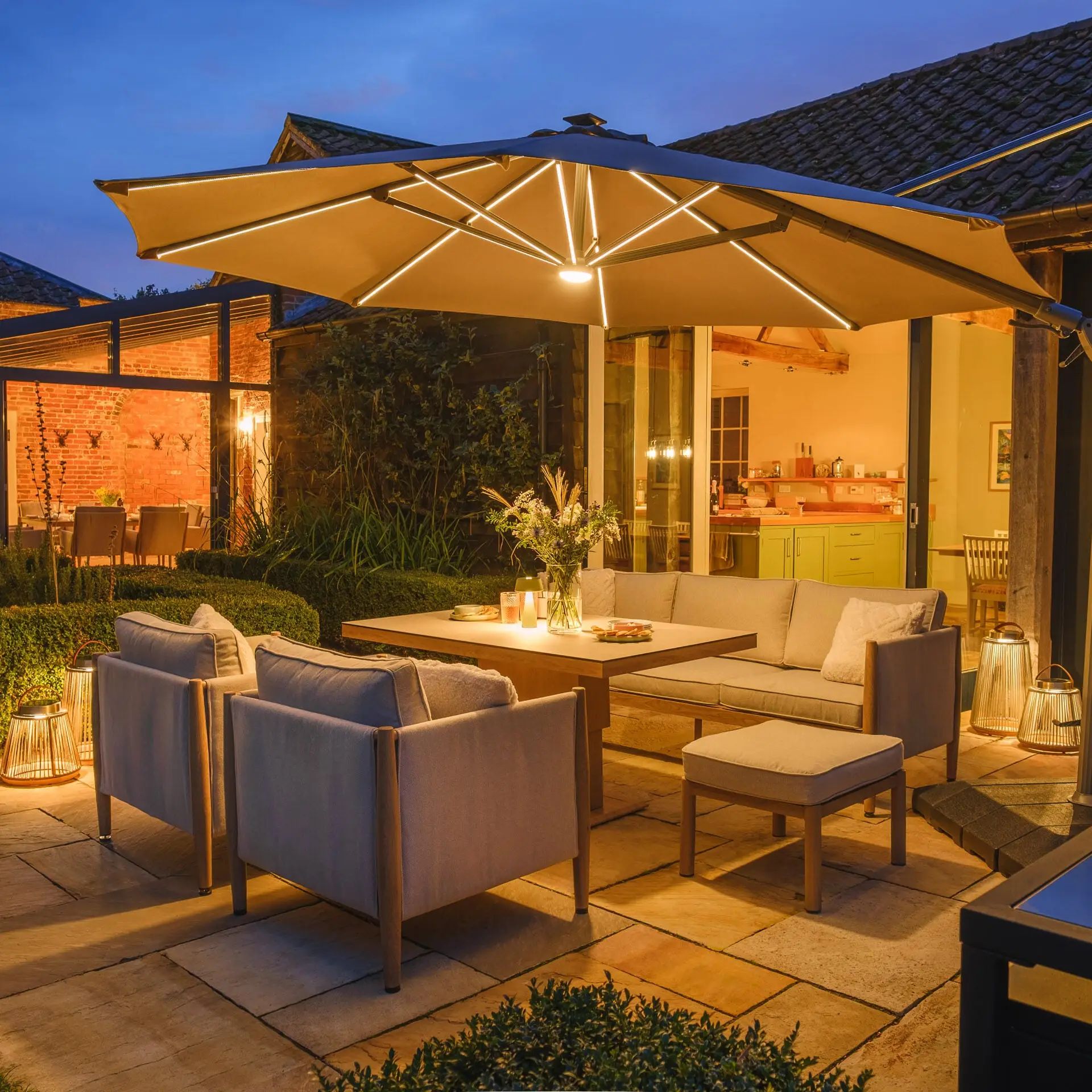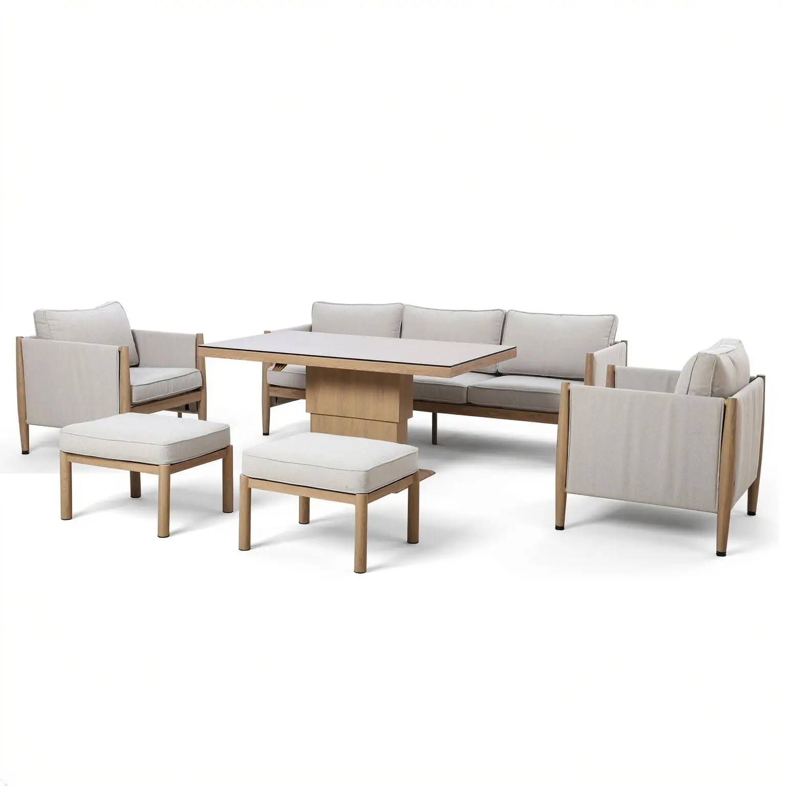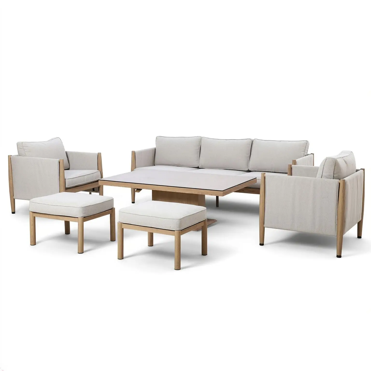 New for 2026, the Burford 3 Seat Aluminium Sofa Dining Set with Rising Table and Footstools in Almond brings a perfect blend of modern design, durability, and comfort to your outdoor space. Crafted with a rust-resistant, powder-coated aluminium frame featuring a heat transfer wood effect, this set combines the warmth of natural wood with the strength and easy maintenance of metal.