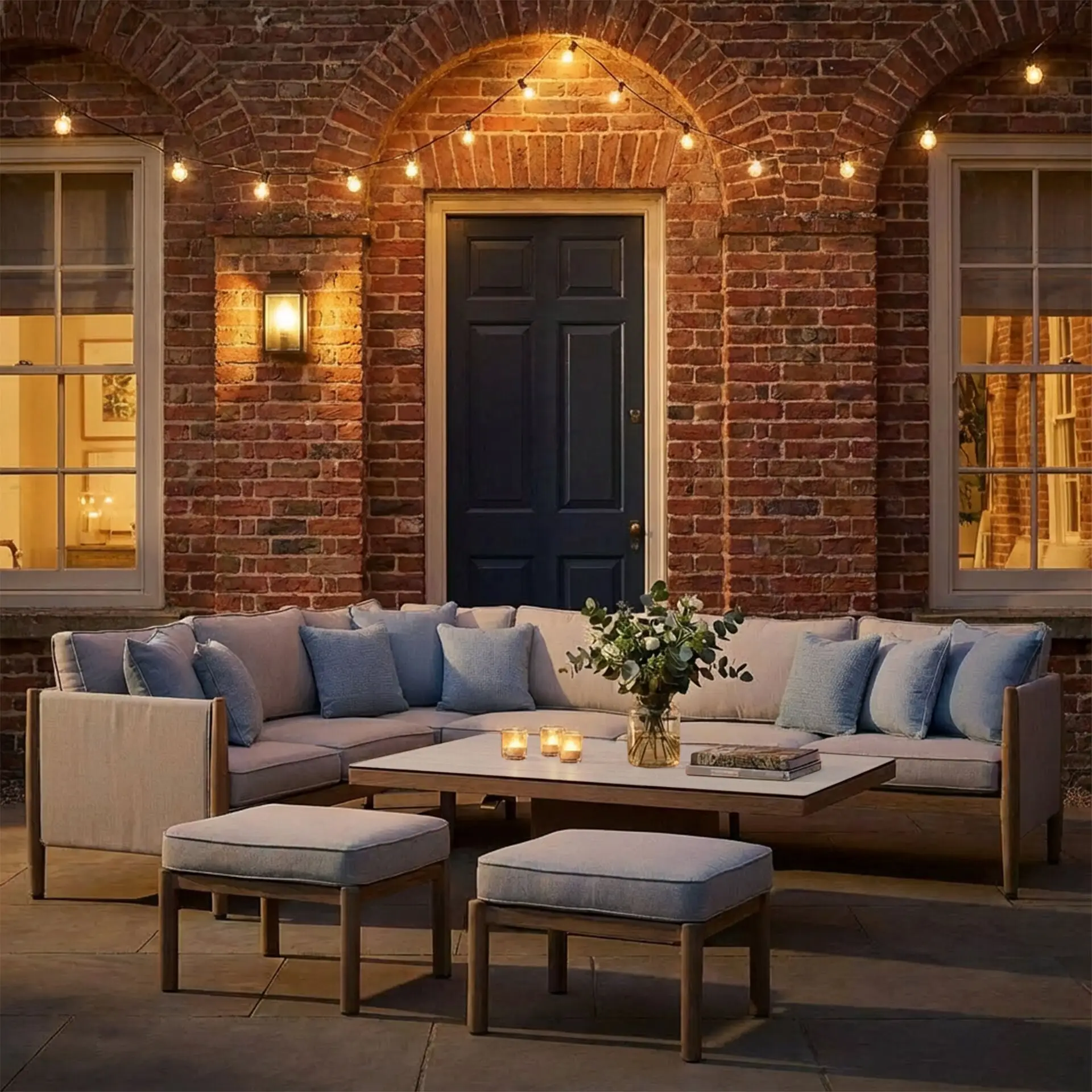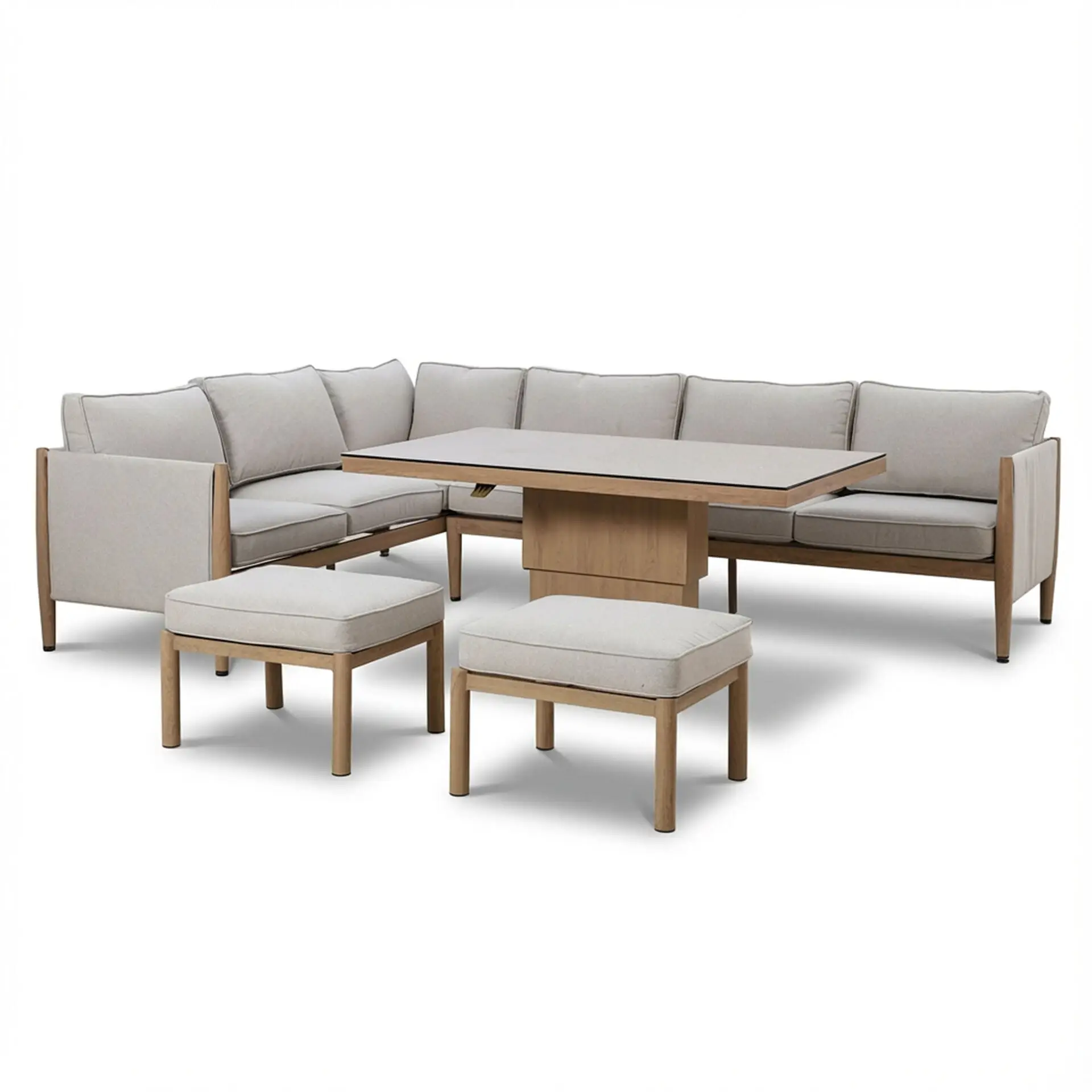 Crafted from rust-resistant, powder-coated aluminium with a warm heat-transferred wood-effect finish, the Burford collection combines the natural beauty of timber with the durability and low maintenance of aluminium. The rectangular rising table adds flexible convenience for drinks, snacks, or casual dining, while piped cushions made from high-performance SeasonSure fabric are shower-resistant, stain-resistant, and easy to clean with removable sleeves.