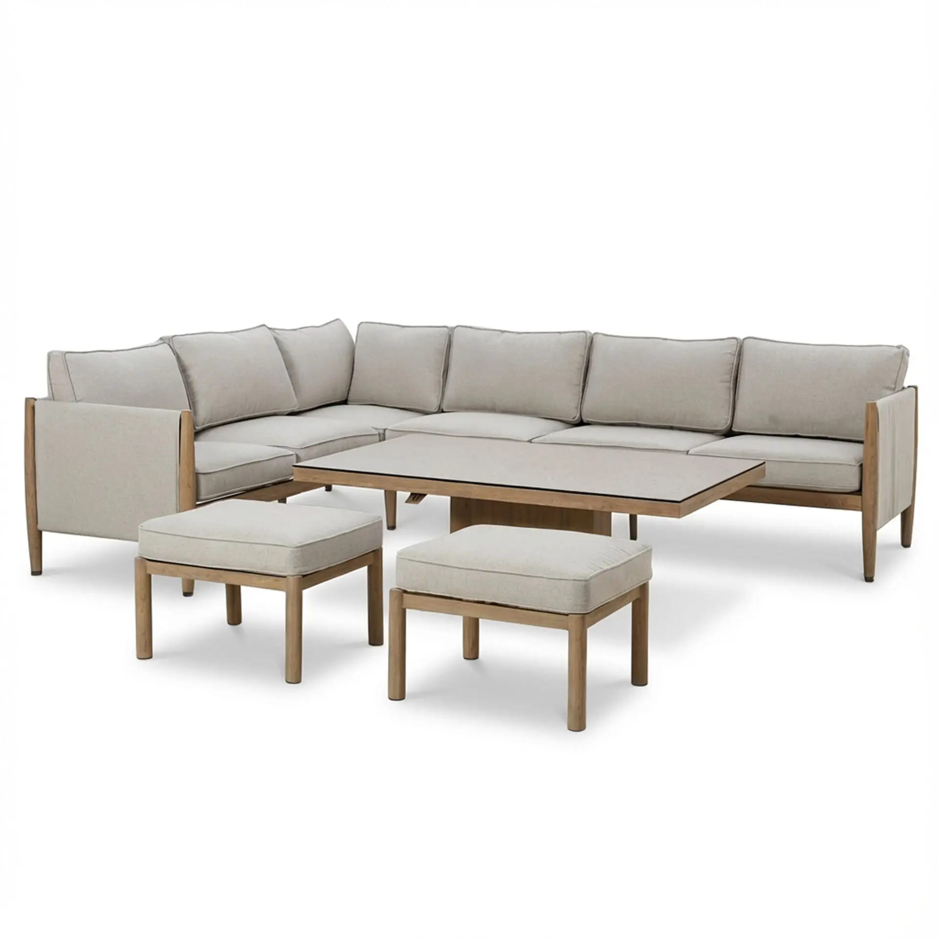 The Burford Large Aluminium Corner Sofa Set with Rising Table and Footstools brings modern design, luxurious comfort, and versatile functionality to your outdoor space. Perfect for patios, terraces, or gardens, this stylish corner sofa set includes a rectangular height-adjustable rising table and two matching footstools, providing the ideal setup for dining, entertaining, or relaxing with family and friends all year round.
