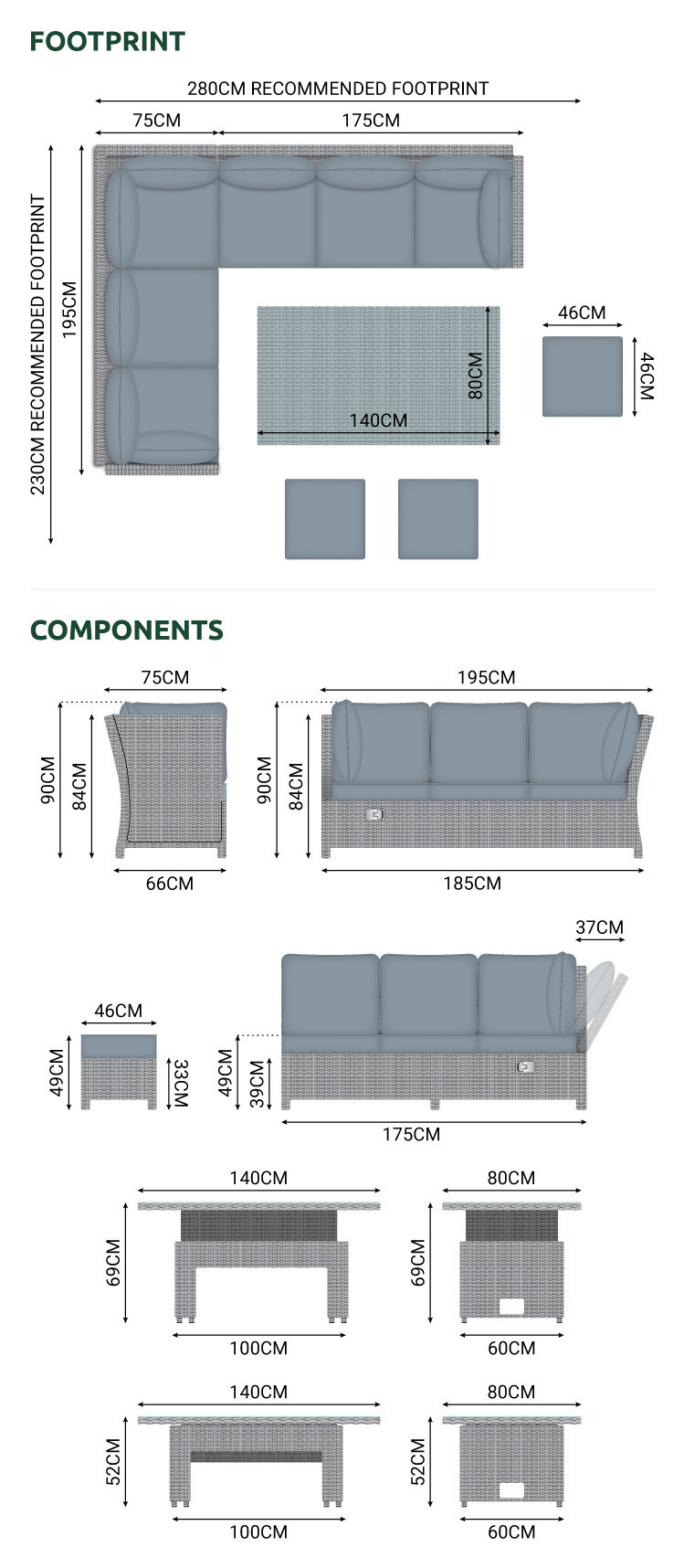 Designed to be a classic, spacious corner dining set, the stunning corner dining set combines a right handed sofa piece and a left hand sofa piece to create a corner sofa, as well as 3 footstools and a rectangular casual dining table