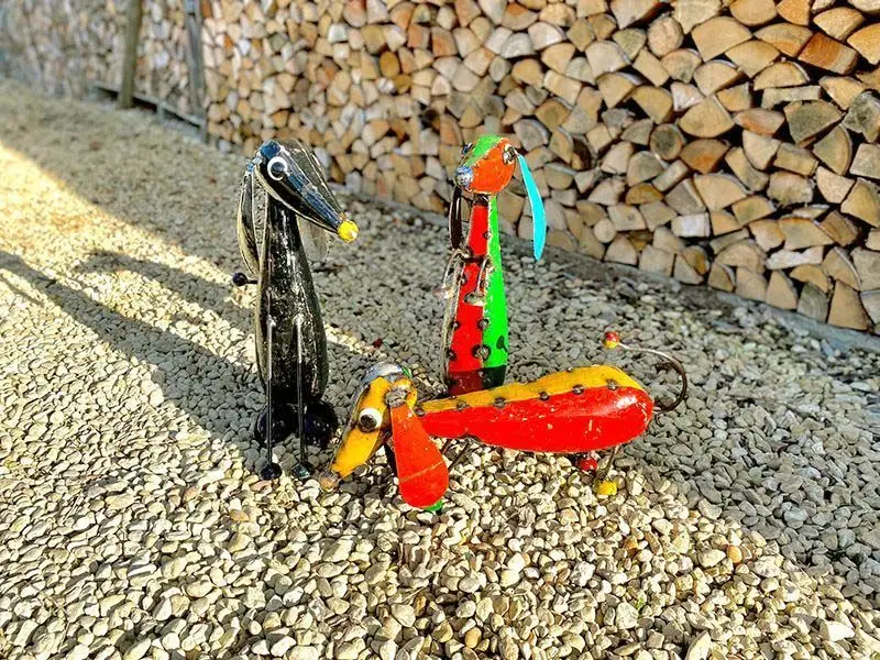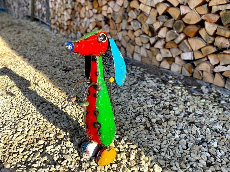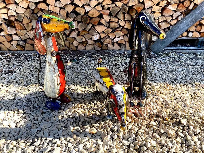 Each piece is handcrafted from upcycled shipping drums and reclaimed metal, making every set truly one of a kind. With meticulous detailing and a durable, multi-layer lacquer finish, these playful pups are perfect for both indoor and outdoor display.