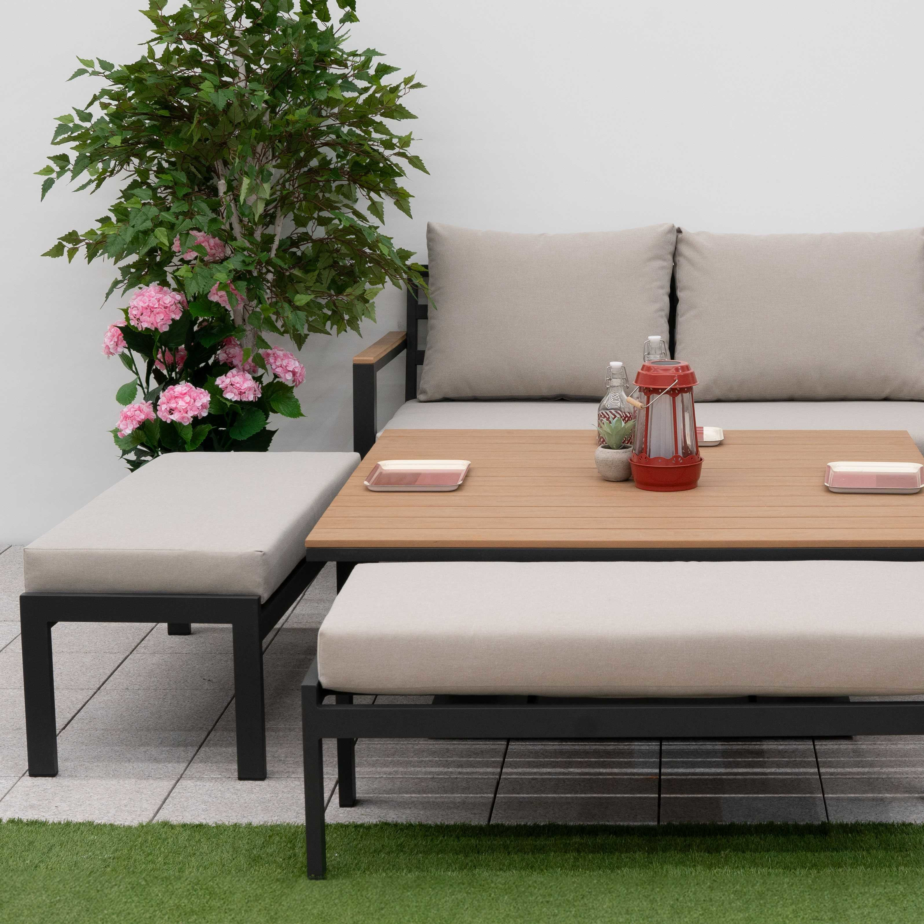 Complementing the polywood, the cushions are crafted from GRS-certified eco fabric, combining comfort with sustainability. The innovative Velcro straps underneath each cushion ensure they stay securely in place, even during breezy summer days adding to the overall look. The collection's sleek powder-coated aluminium framework adds a touch of elegance while providing a sturdy, rust-resistant structure. Its timeless design makes the Heidi Collection a versatile choice for any outdoor space.