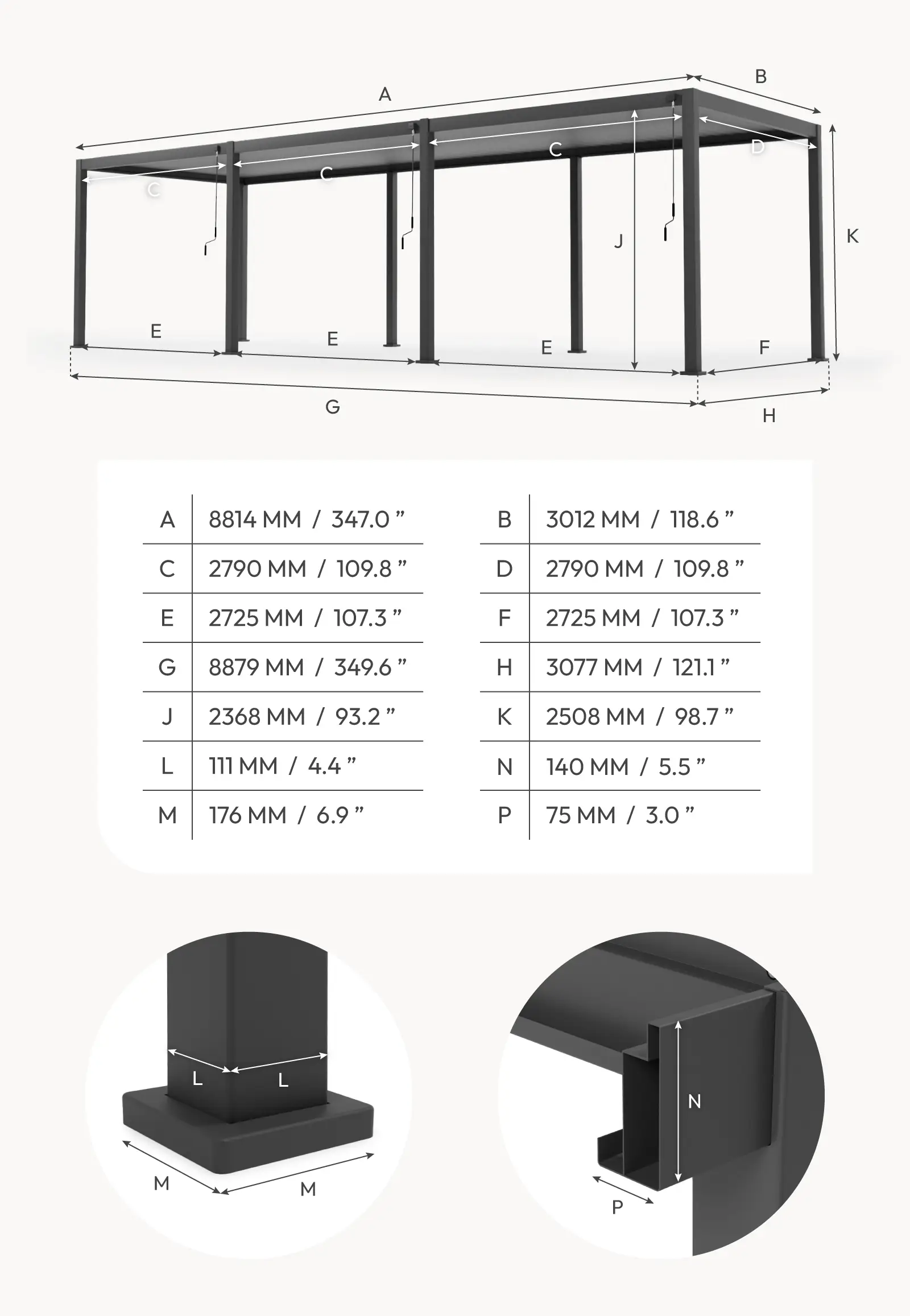 Legacy pergola is built to withstand the elements, with a weather-resistant aluminium frame and a high-quality TIGER Drylac powder coating for extra durability. UV protection prevents fading, ensuring it looks great year after year. A white pergola brightens your outdoor space, creating a fresh, modern look while enhancing natural light and complementing any garden style with its timeless elegance. Virtually maintenance-free, it’s designed for long-term outdoor use.