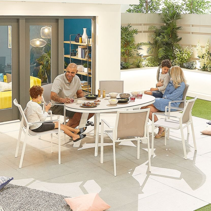 A stunning aluminium dining set, perfect for medium and large patio spaces. This great aluminium furniture offers space for 6 to dine alfresco and is designed for style and practicality with the sleek design of the Milano dining chairs.