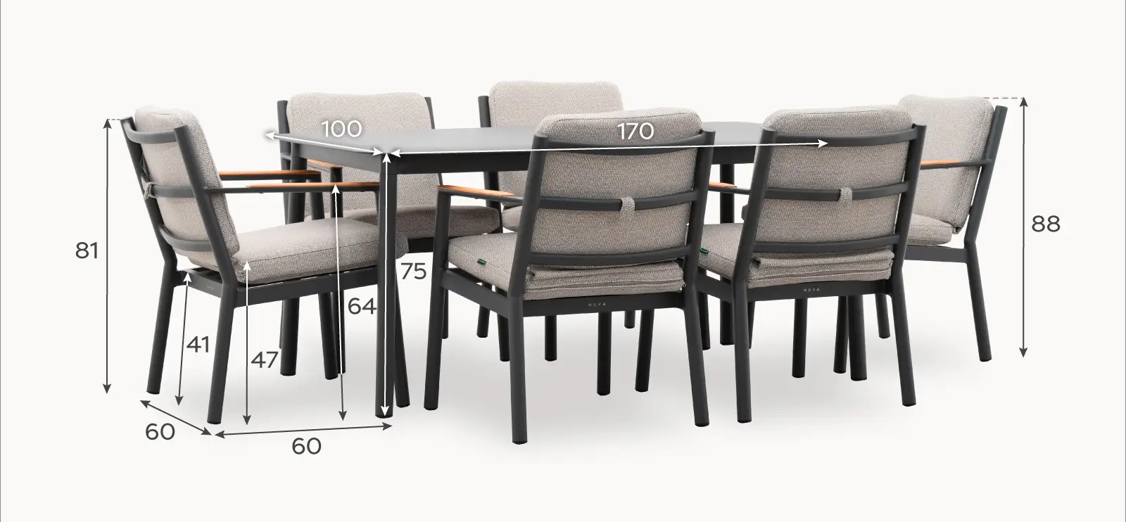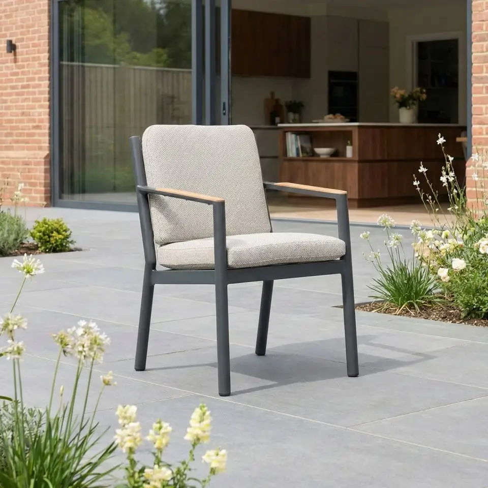 The 'Monti' range is defined by its signature teak wood armrests, which bring natural warmth and contrast to the sleek, black slatted frames. Finished in durable grey powder-coated aluminium. With uniquely shaped base cushions and textured upholstery, this collection brings a designer feel to your garden – combining visual interest with everyday relaxation. Deep, supportive seating invites you to sink in, whether you’re dining al fresco or lounging with a drink in hand.