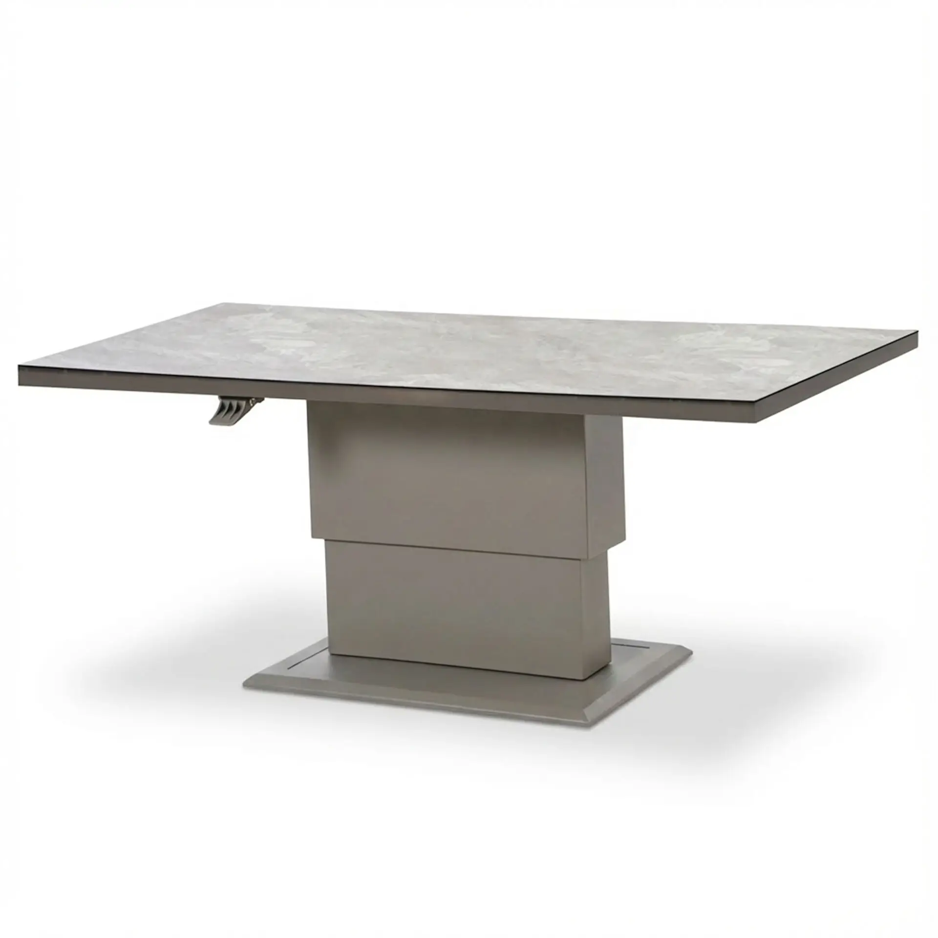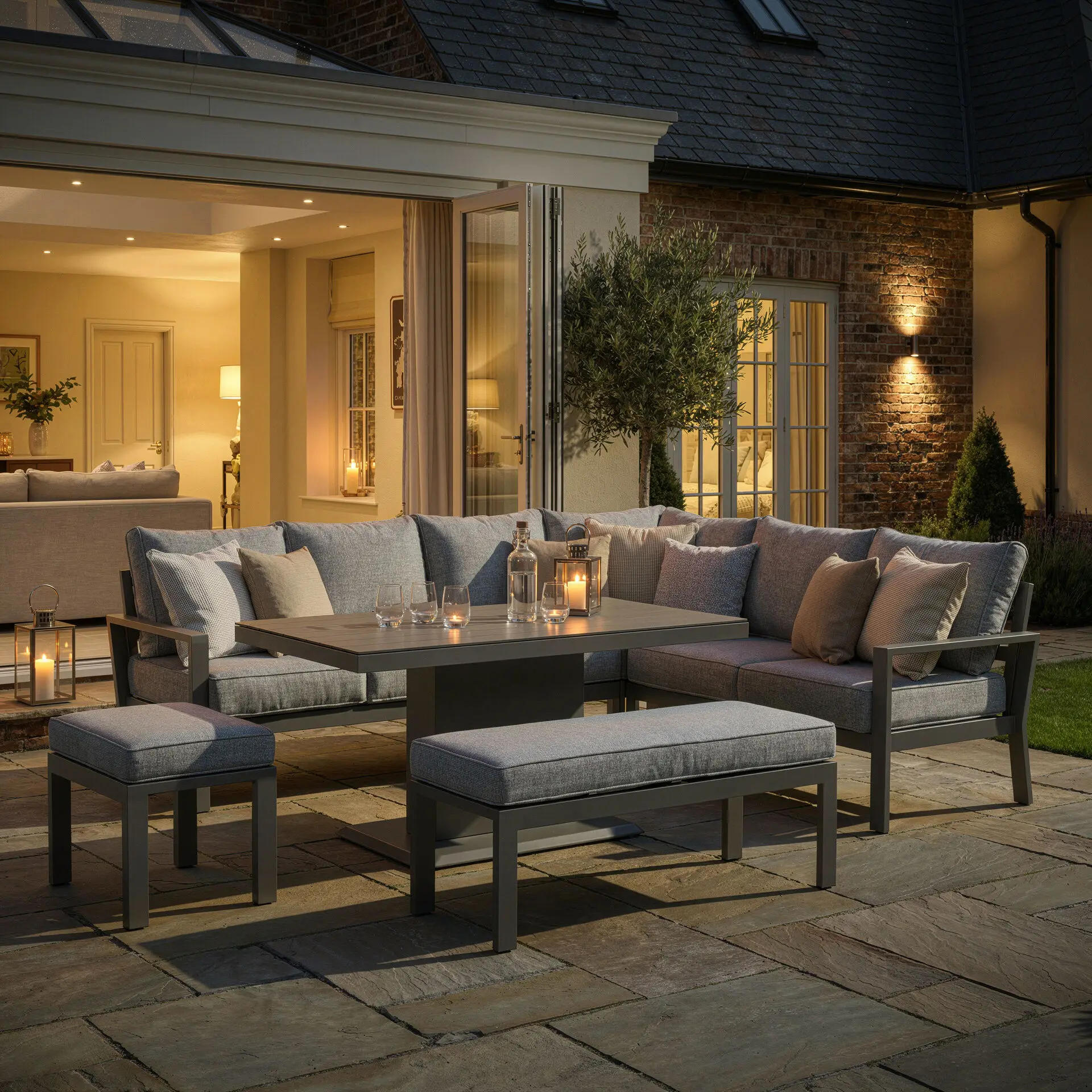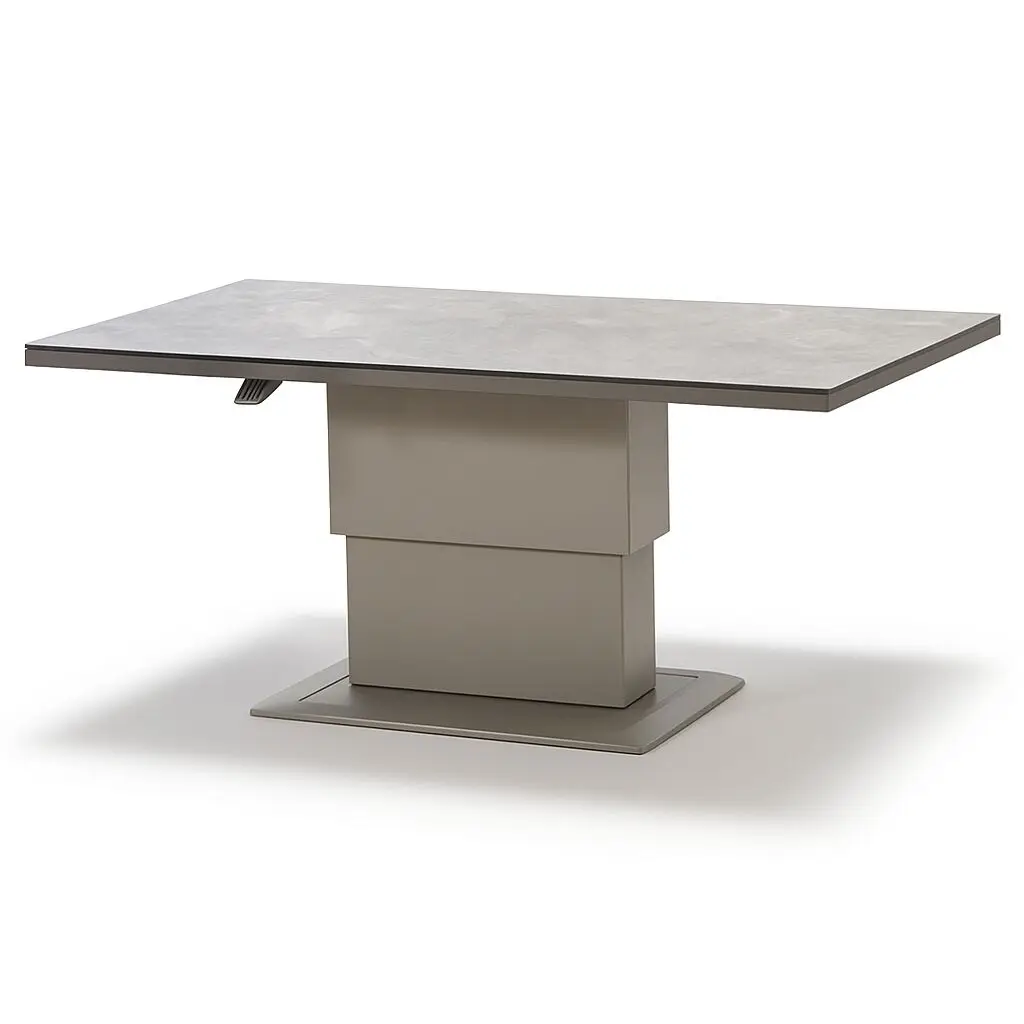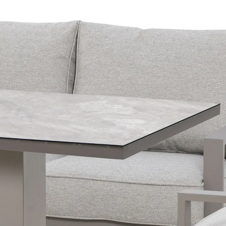 This outdoor garden sofa set features a corner sofa with plush, weather-resistant Cool Linen cushions, delivering a soft and inviting feel. The centrepiece is the ceramic glass rising table, which effortlessly adjusts in height to serve as either a dining table or a coffee table. Its smooth, durable surface is easy to clean and designed to withstand outdoor conditions, making it as practical as it is stylish.