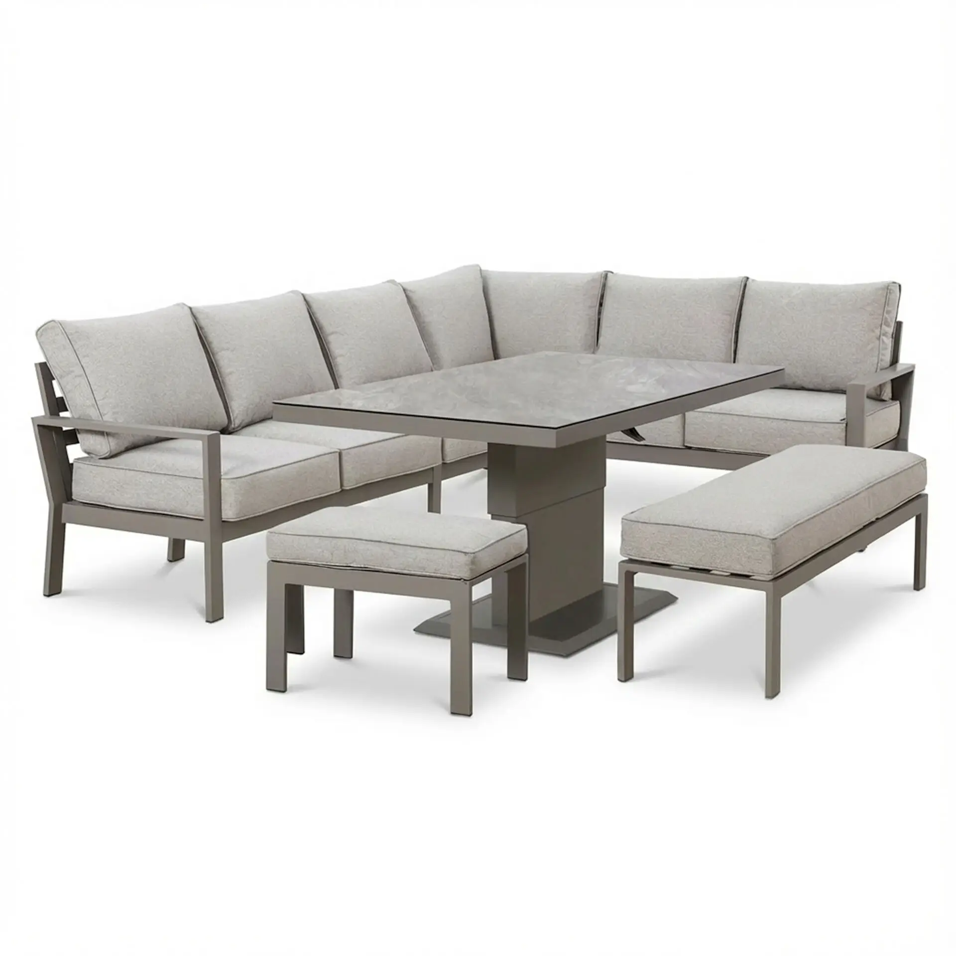 Aluminium with Rectangular Rising Table, Footstool & Bench, designed to combine comfort, style, and versatility in one compact package. Perfect for patios, terraces, or garden corners, this casual dining set provides everything you need for casual meals, drinks, or relaxing outdoors.
