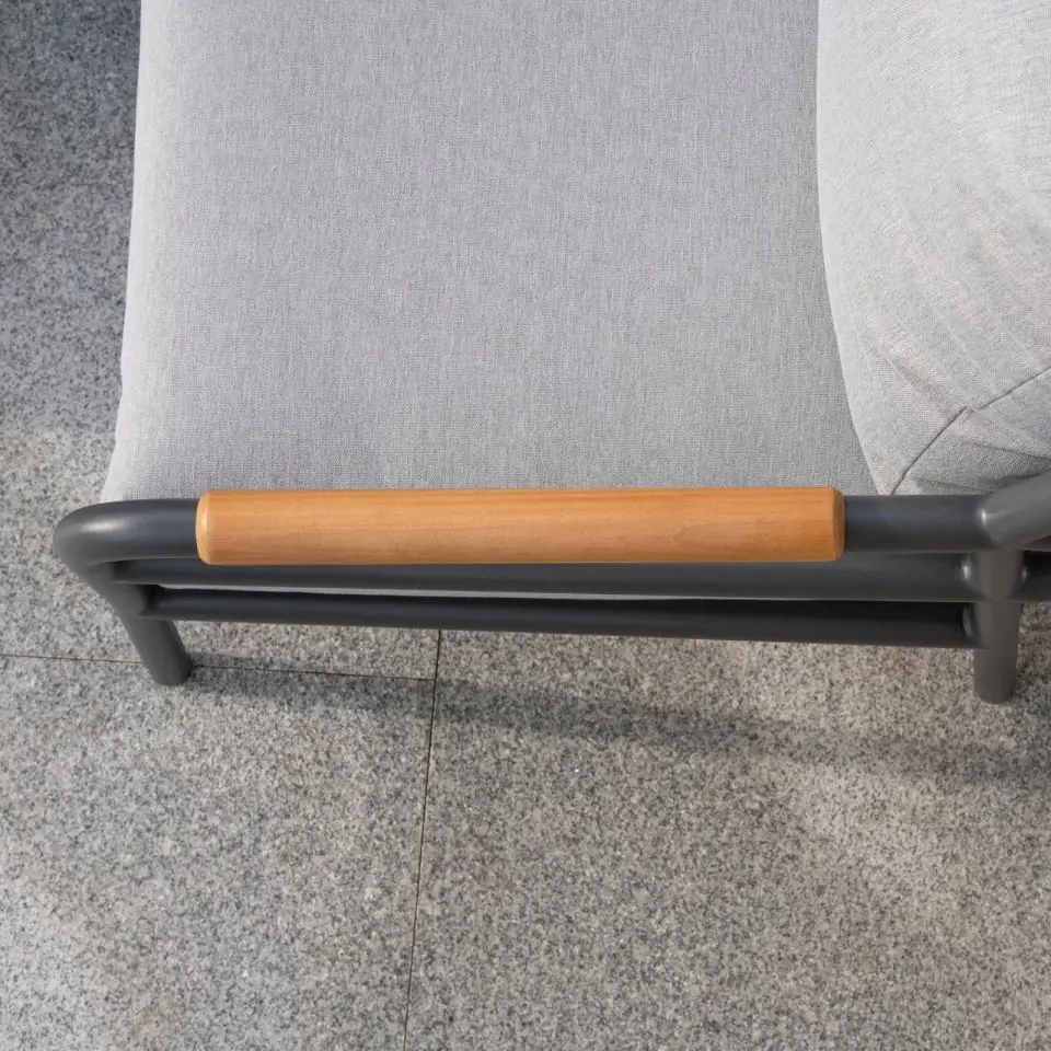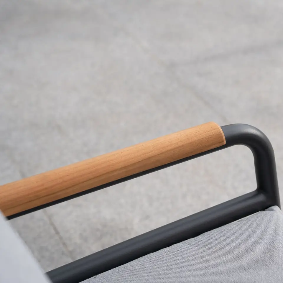 Elevate your outdoor aesthetic with the timeless allure of our powder-coated aluminium frame, meticulously finished in a sophisticated graphite grey. The epitome of understated elegance, this durable frame promises both longevity and style. Every detail of our lounging set exudes charm, from the handcrafted, rounded teak armrests to the traditional-inspired round tubes found throughout the frame. We finished off the set with accents of natural teak, a wonderfully beautiful wood perfect for outdoor furniture. Due to its natural properties, your teak armrests may change in colour and texture over time. This is very normal with teak, and the ageing all adds to the material's charm. To keep the texture as smooth as possible, we do recommend sanding your teak regularly and apply a teak oil (follow the instructions on the oil label) to prolong the effect after sanding. The aluminium framework can be cleaned by wiping down with a damp soft cloth.