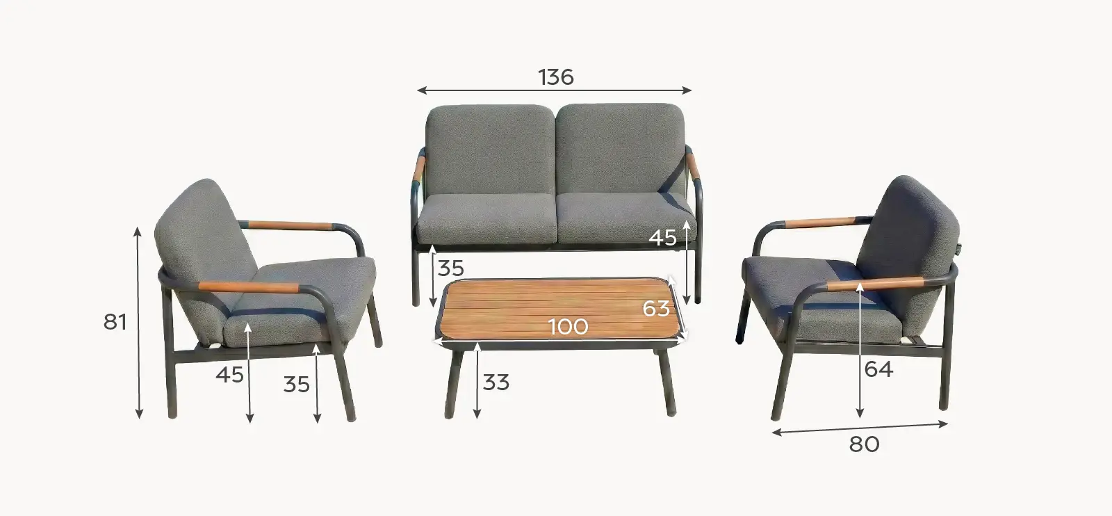 Elevate your outdoor aesthetic with the timeless allure of our powder-coated aluminium frame, meticulously finished in a sophisticated graphite grey and wood effect table tops and backrests. The epitome of understated elegance, this durable frame promises both longevity and style. Every detail of our lounging set exudes charm, from the handcrafted rounded teak armrests to the traditional-inspired round tubes found throughout the frame. We finished off the set with accents of natural teak, a wonderfully beautiful wood perfect for outdoor furniture. Due to its natural properties, your teak armrests may change in colour and texture over time. This is very normal with teak, and the aging all adds to the materials charm. To keep the texture as smooth as possible, we do recommend sanding your teak regularly, and apply a teak oil (follow the instructions on the oil label) to prolong the effect after sanding. The aluminium framework can be cleaned by wiping down with a damp soft cloth.