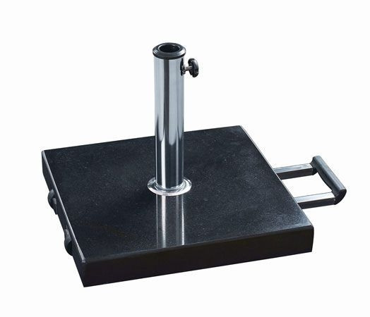 A square black granite parasol base weighs 40kg and comes with a 60mm dia stainless steel tube with 38mm dia & 48mm dia adapter as well as a luggage type handle for ease of movement