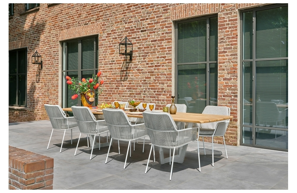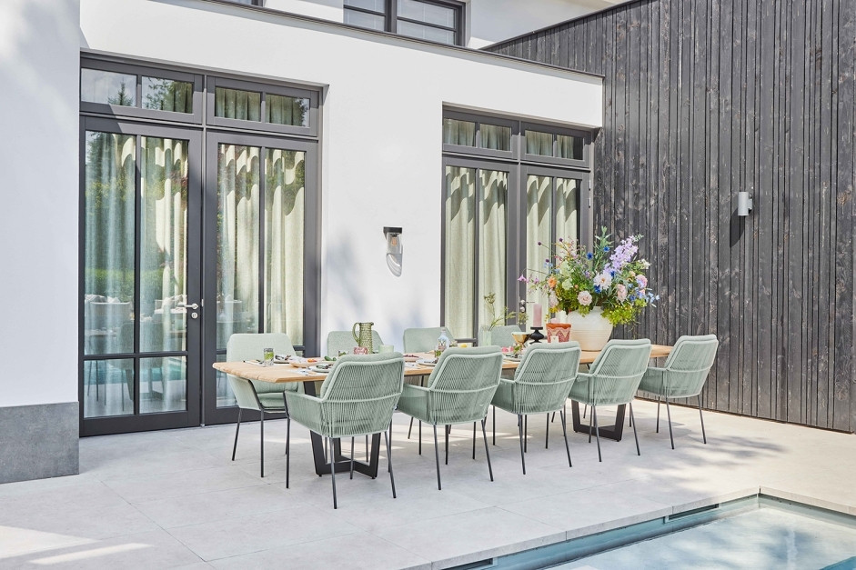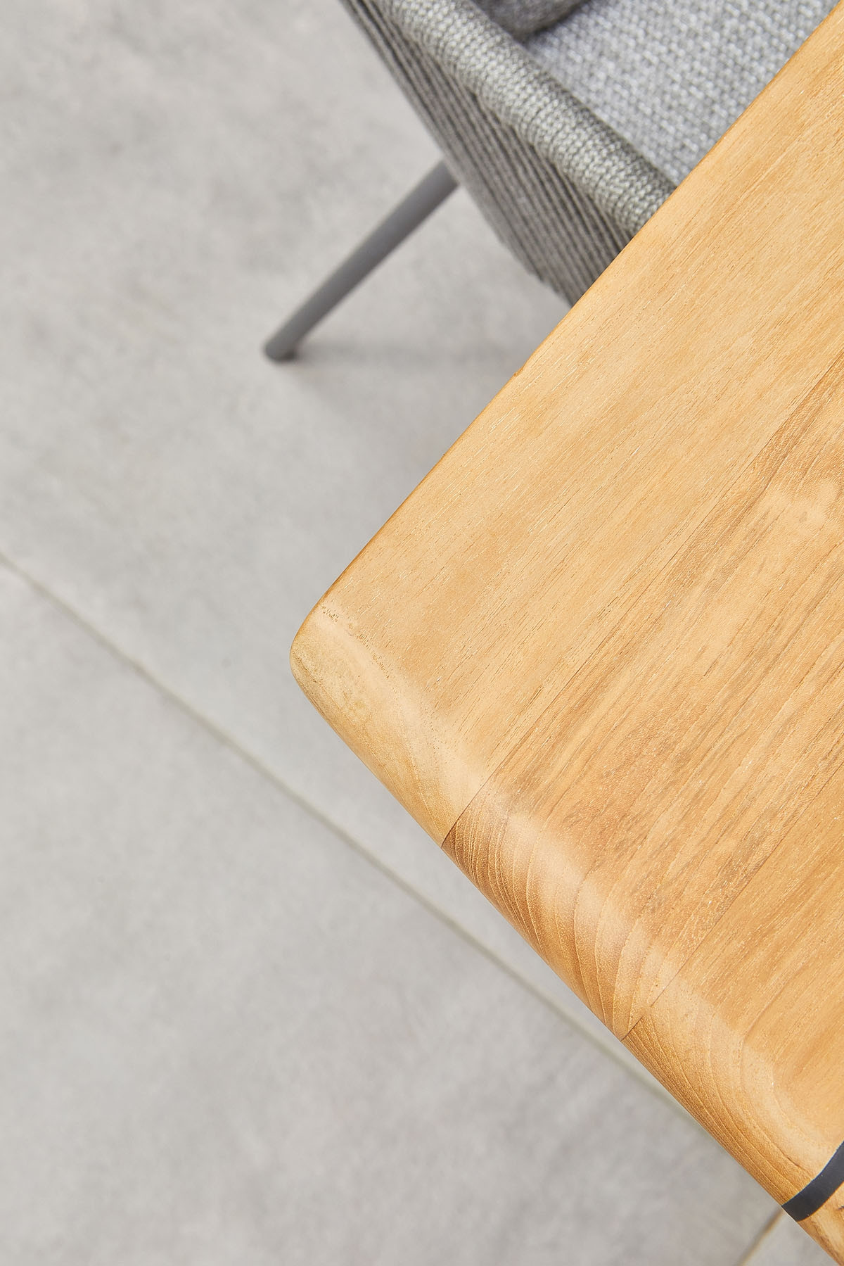 The table top is made of teak. This tropical wood species has excellent outdoor qualities. It is moisture-resistant, weatherproof and has a long life. Over time, teak discolours into a pleasant warm grey. This is part of the natural character of the wood.