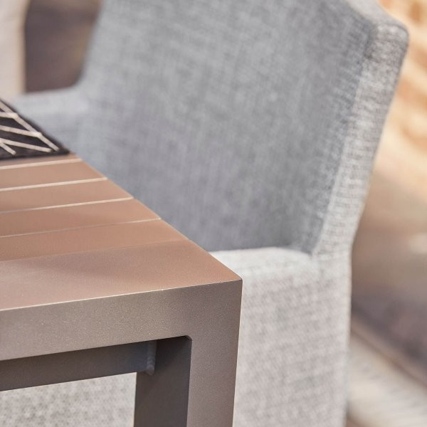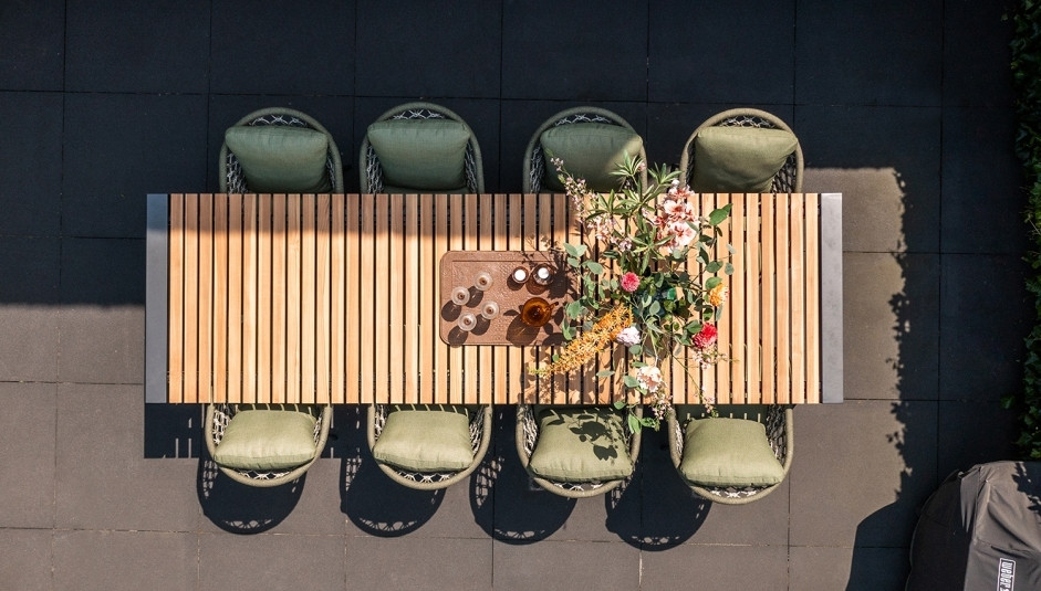 The tabletop is made of aluminium or teak slats. Both materials are exceptionally weatherproof. In time, teak gets a warm grey colour, which is part of this material's charm. As the table is made with all high-quality materials, it can remain outdoors all year round.