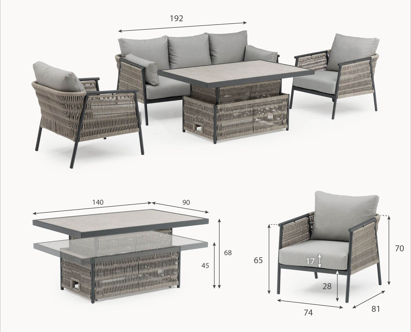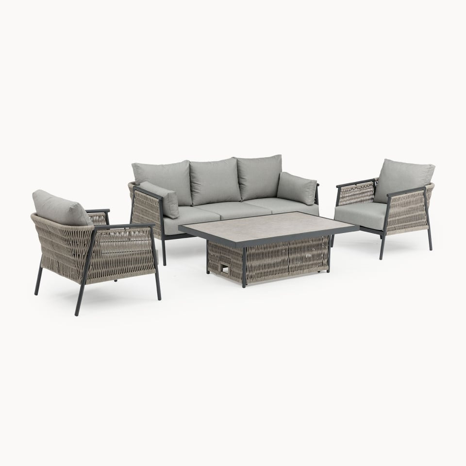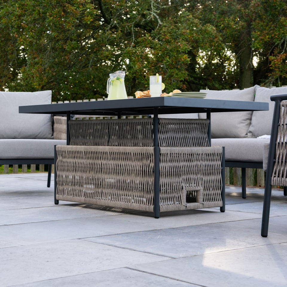 The collection comes with a ceramic glass-topped table. This elegant addition is not just about looks; it offers practical functionality, too. The rise and fall table design allows you to switch between a dining and lounging set up effortlessly, with two people easily lifting it into place. Assembly is a breeze with provided instructions, ensuring you can start enjoying your set without hassle.
