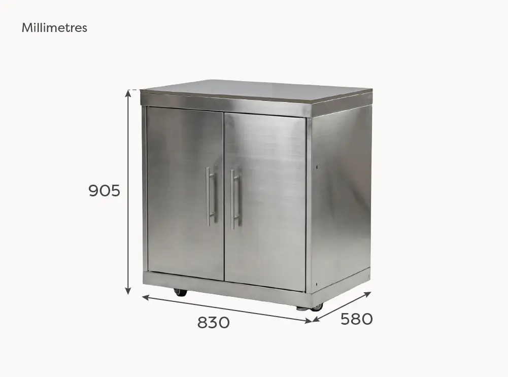 The double-door cupboard design offers generous internal storage, ideal for organising cookware, utensils, and BBQ accessories. Inside each cupboard is a removable shelf that can be installed or left out depending on your storage requirements, allowing you to easily accommodate both smaller items and taller equipment.