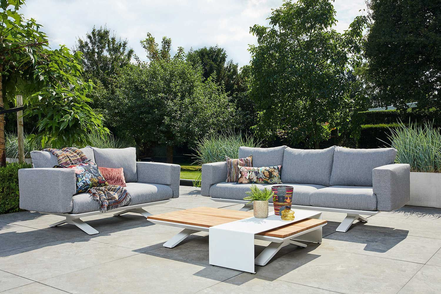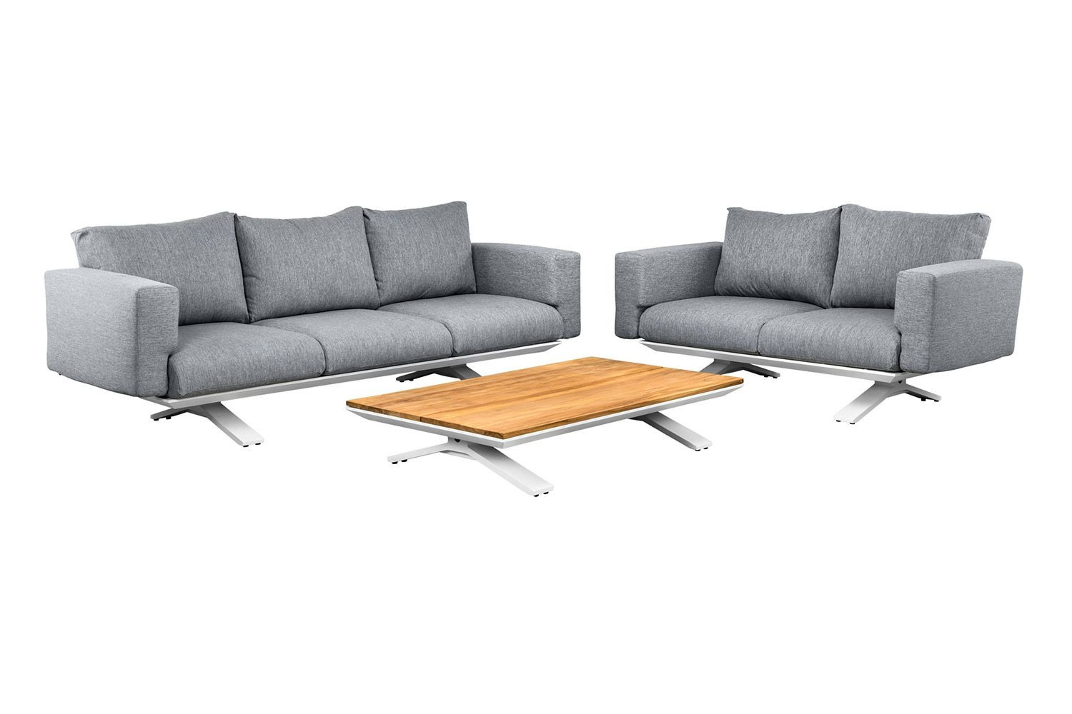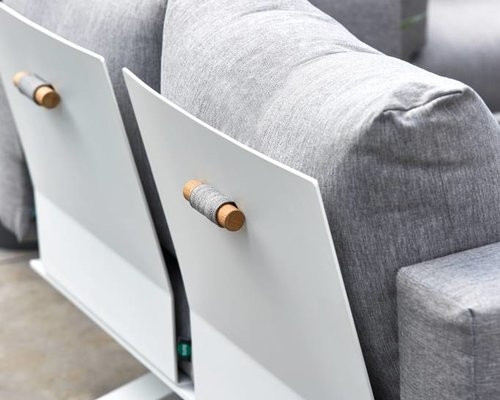 High-quality and durable materials. As a result, the sets can remain outside all year round. The frame, made of robust aluminium, was combined with certified teak in a natural colour. This type of wood is weather-resistant, strong and durable. Teak fades over the years, into a naturally warm grey. The armrest is made of Fast Dry Foam which easily drains (rain) water and dries quickly. The design and innovative materials make this a stylish sofa set.