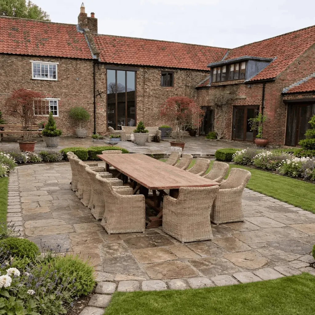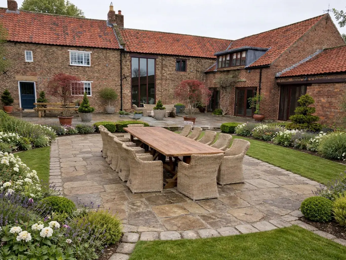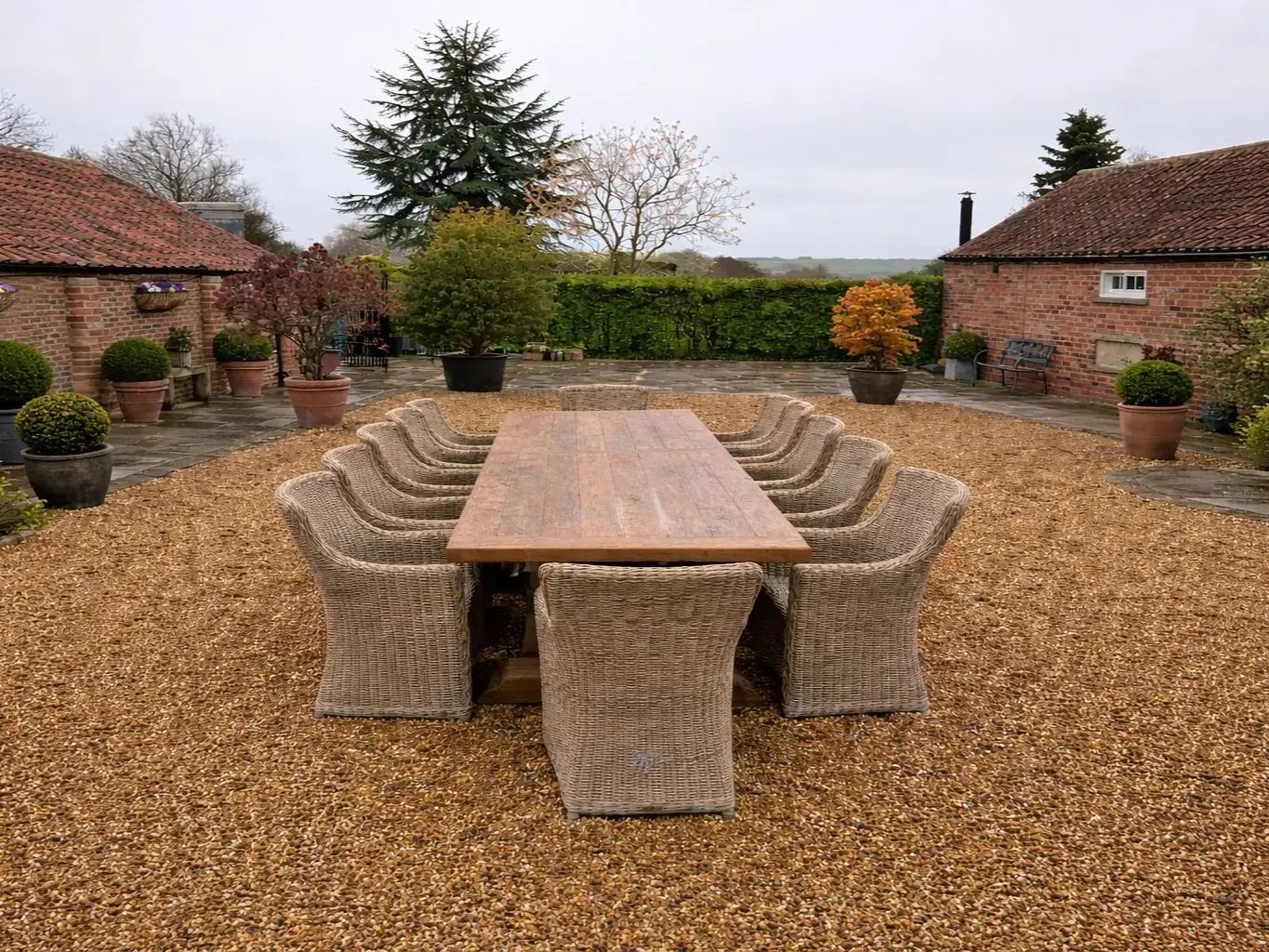 With a stunning four-metre reclaimed teak Valencia Table and 12 handwoven outdoor rattan armchairs, it works perfectly in commercial settings and large domestic premises.