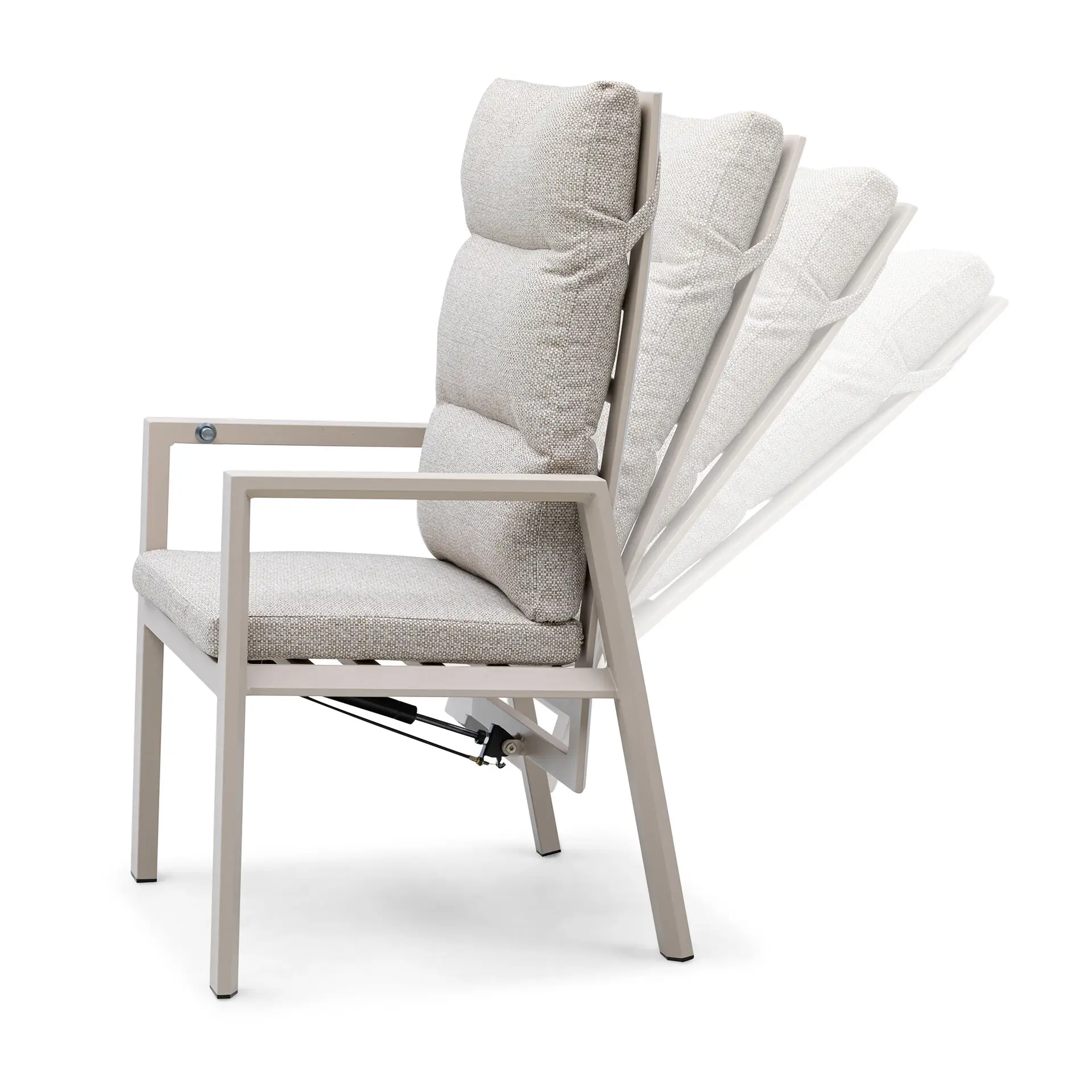 Each garden chair offers reclining functionality for ultimate comfort, complemented by soft, weather-resistant olefin fabric cushions. The aluminium construction and high-quality materials mean this set can be safely left outside during the warmer months, making it a low-maintenance, practical choice for your garden or patio.