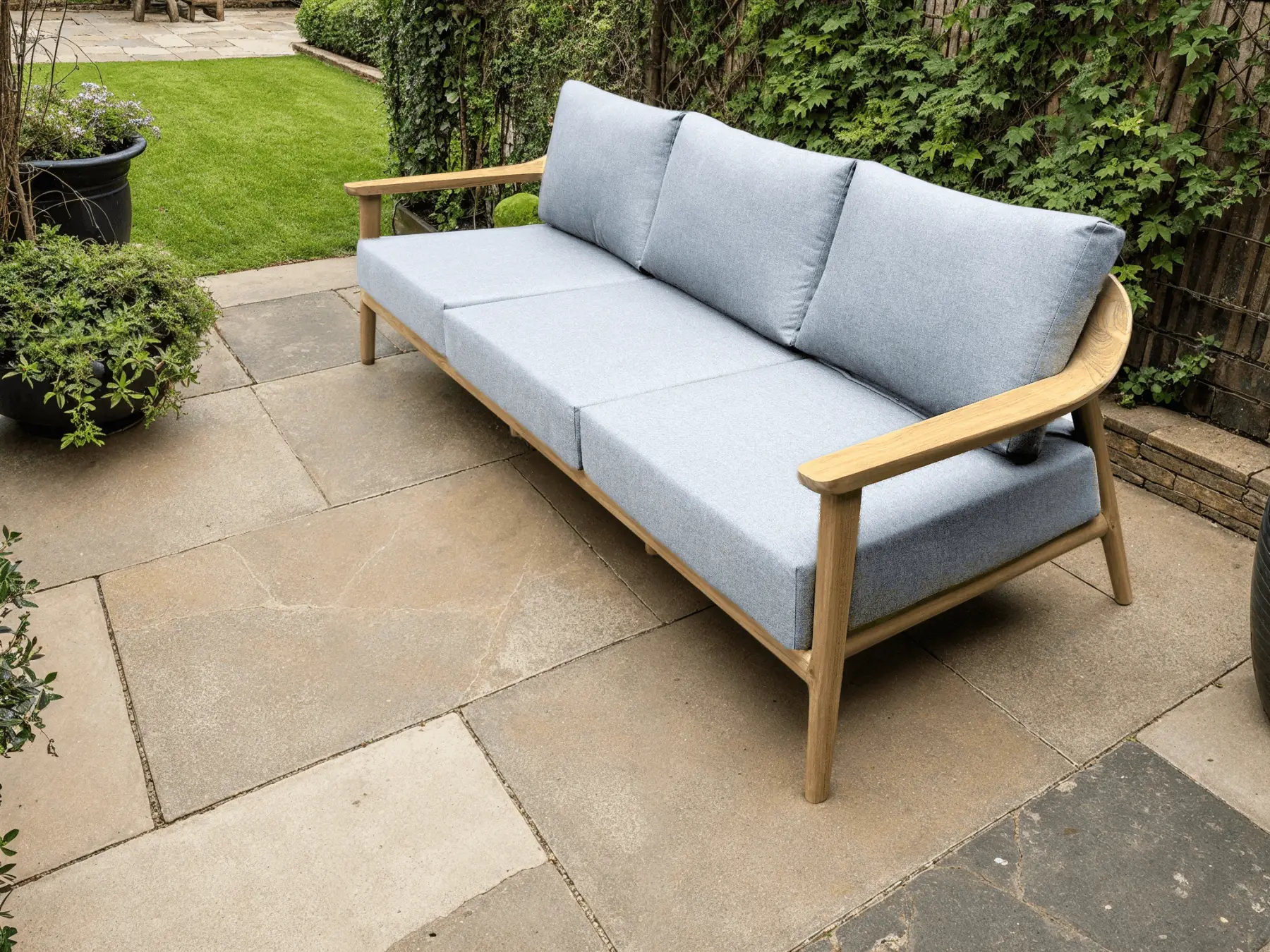 - Light grey acrylic cushions – weather-resistant and easy to clean