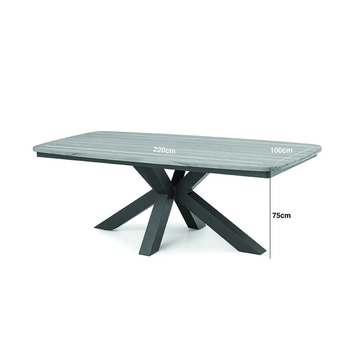 A stunning centrepiece for your outdoor space, combining contemporary design with timeless elegance. This beautifully crafted table features a sleek aluminium frame in a sophisticated charcoal finish, providing both durability and a modern aesthetic.