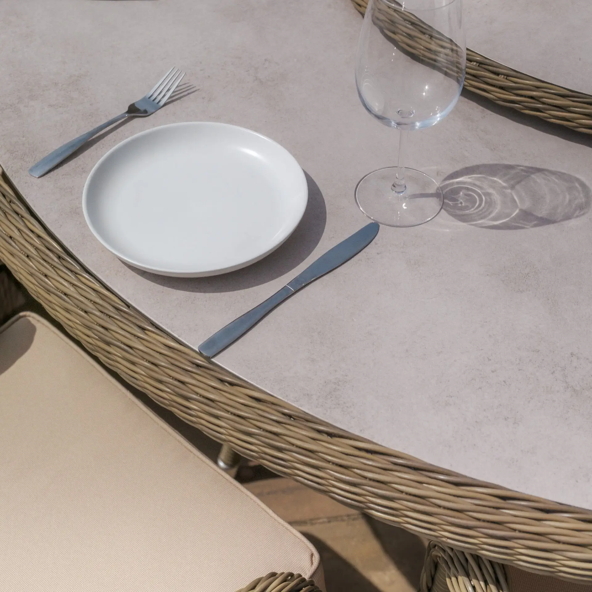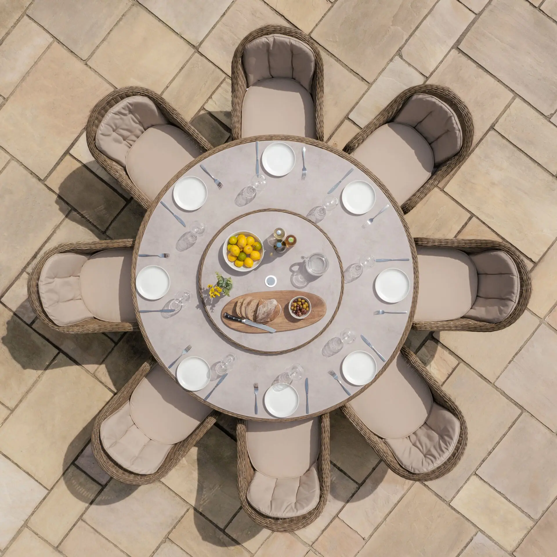 The spacious round dining table features a stunning cream ceramic top that is both stylish and practical, offering a refined surface that’s easy to maintain and ideal for outdoor living.