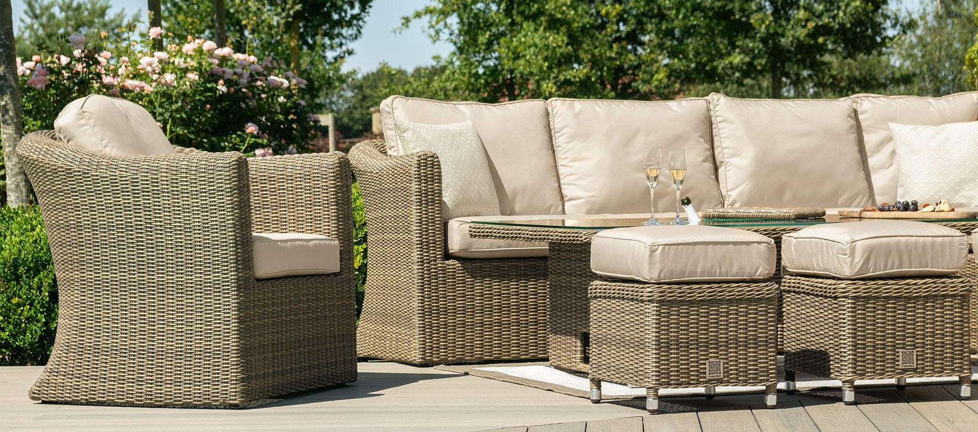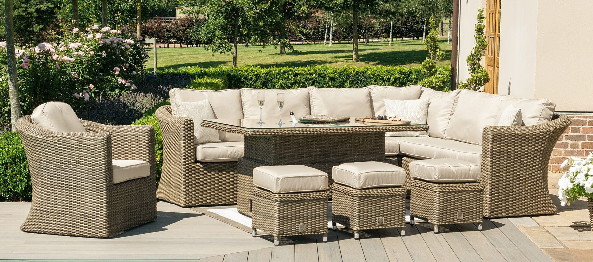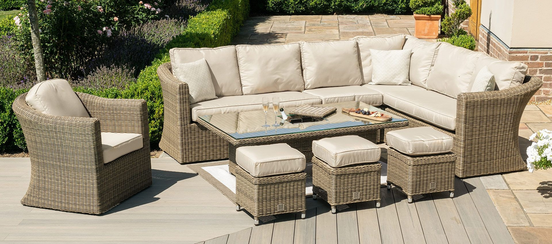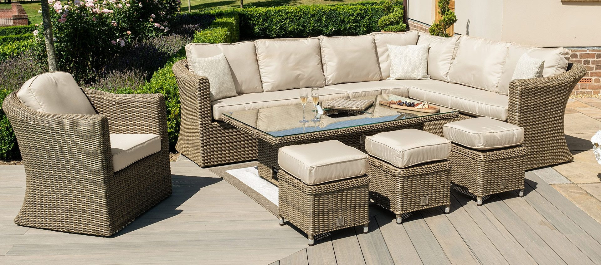 The rising table provides great versatility for your outdoor space. It will allow you to go from dining to lounging as it transforms from a dining table to a coffee table with ease. The Winchester Deluxe Corner Sofa is designed to adapt to your outdoor space thanks to a detachable middle section, meaning you have the freedom to place your sofa on the left or the right.