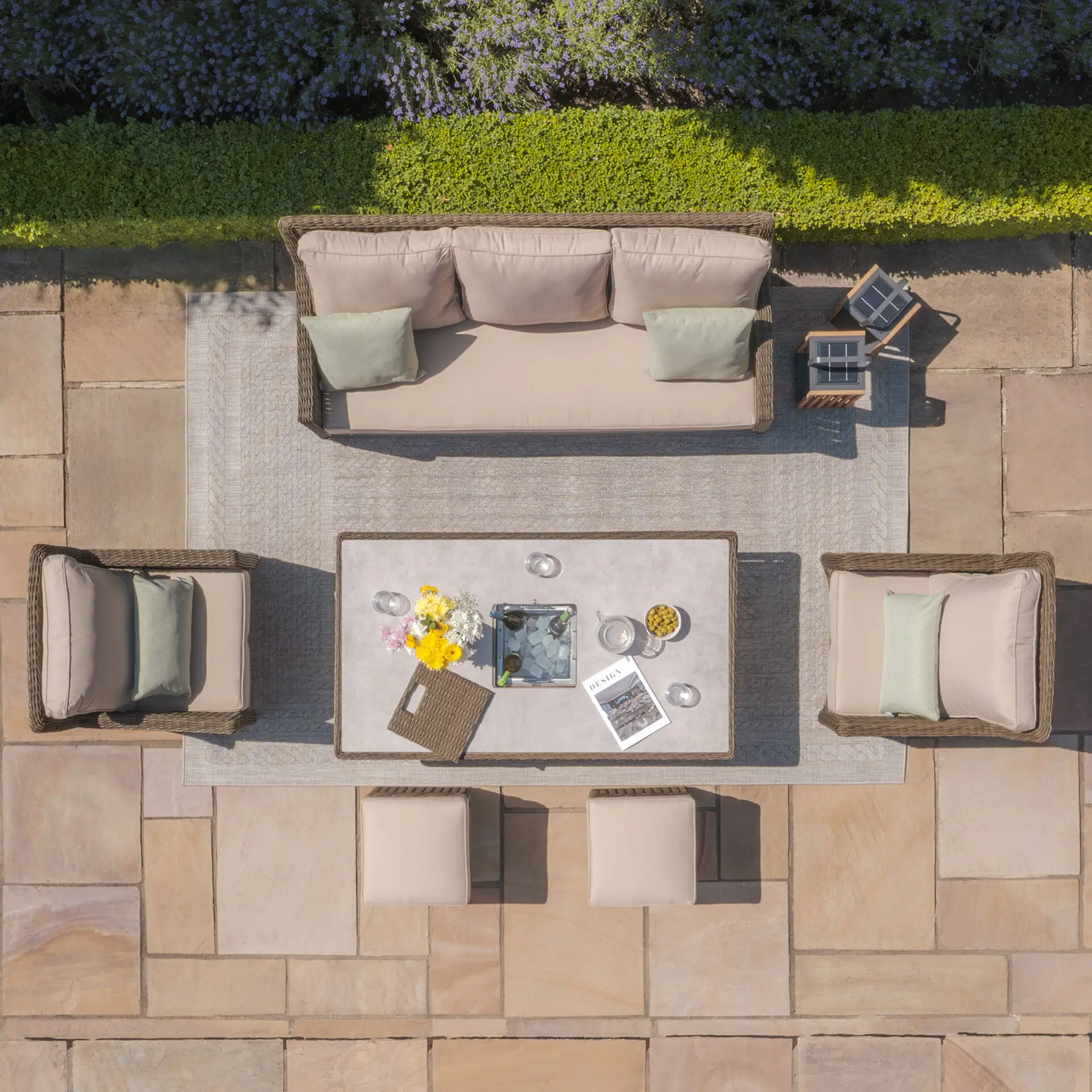 Sofa Dining Set is high quality and stylish furniture set perfect for dining in comfort in the summer months. The Winchester Sofa Set is made with half-rounded rattan weave, handwoven onto a sturdy powder-coated aluminium frame for a rust-free design to ensure use all year round.