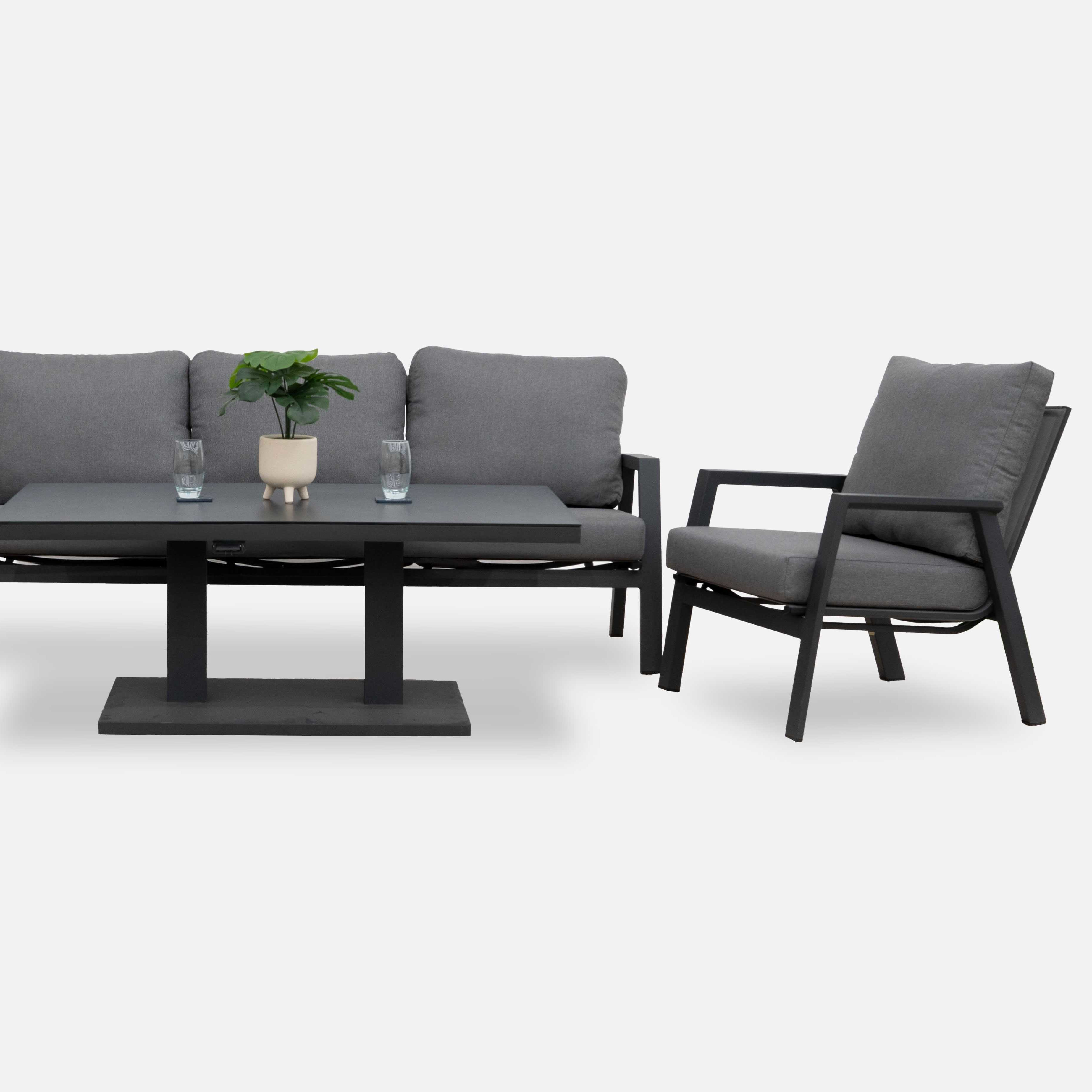 Create a sleek and contemporary outdoor haven with the Nova - Zara 3 Seater Sofa Dining Set with Rectangular Rising Table - Grey. Crafted entirely from powder-coated aluminium, this collection offers a modern aesthetic while ensuring durability and rust-free, low-maintenance performance.